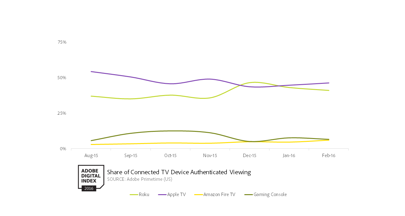 Video: Der Anteil von Apple TV an den Premium Video Views (authenticated) fiel seit August 2015 um 8 Prozent. In der gleichen Zeit konnte Roku um 4 Prozent zulegen. Doku gibt es in Deutschland im Moment nicht.