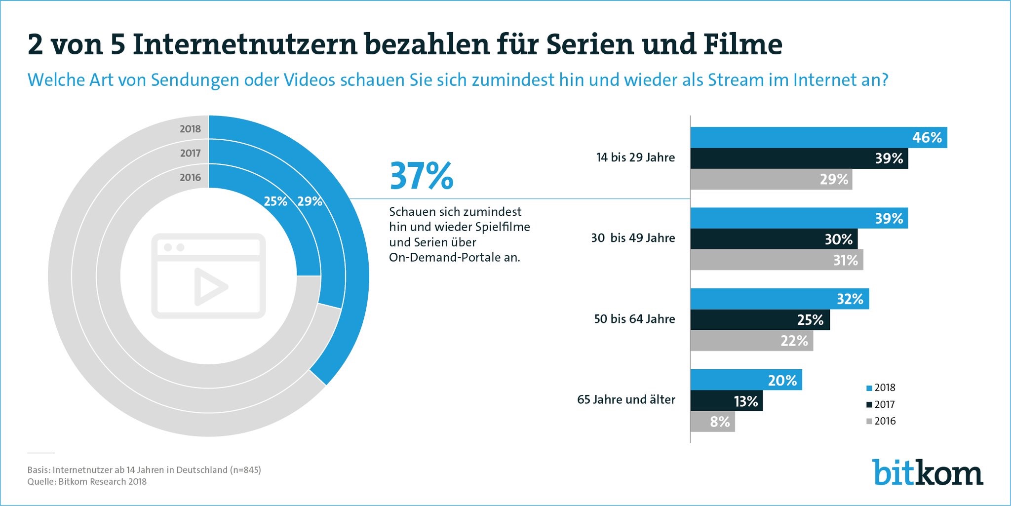 Im Vorjahr waren es erst 29 Prozent. Das ist das Ergebnis einer repräsentativen Umfrage unter 1.007 Personen ab 14 Jahren im Auftrag des Digitalverbands Bitkom. Vor allem Jüngere zwischen 14 und 29 Jahre greifen auf die Angebote zurück: In dieser Altersgruppe streamt fast jeder Zweite hin und wieder (46 Prozent) Serien und Filme über kostenpflichtige Portale. Unter den 30- bis 49-Jährigen sind es vier von zehn (39 Prozent), bei den 50- bis 64-Jährigen noch rund ein Drittel (32 Prozent).
