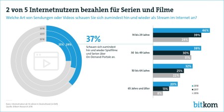 Waren es in den vergangenen Jahren vor allem die jüngeren Internetnutzer, die Flatrates auf Serien und Filme zu schätzen wussten, nutzen nun auch die Älteren die Angebote immer mehr. In der Generation 65plus ruft jeder fünfte Internetnutzer (20 Prozent) Spielfilme und Serien über kostenpflichtige Video-Streaming-Dienste ab. 2016 waren es erst 8 Prozent, 2017 13 Prozent. Und das kann ich ebenso bestätigen. In vielen meiner Seminare sitzen Senioren, die sich Zug um Zug an Streaming Video heranwagen. Der Erklärungsbedarf am Anfang ist etwas hoch, aber wenn die Senioren Blut geleckt haben, sind sie treue Streaming Nutzer.