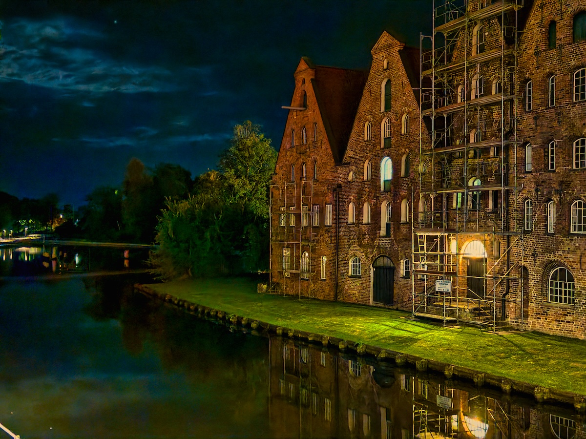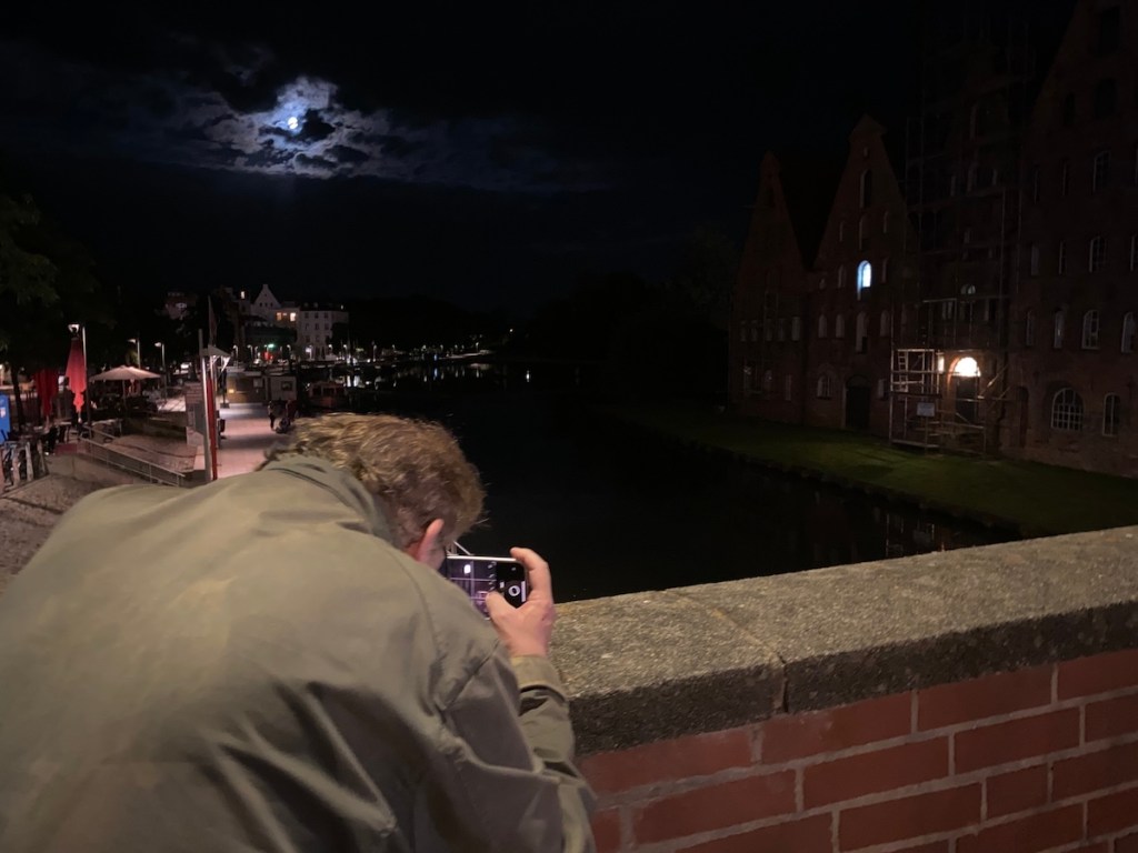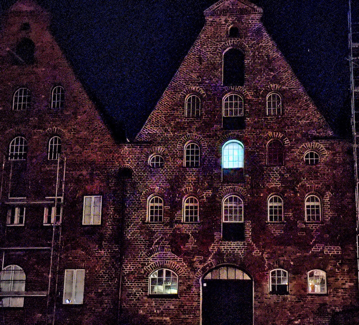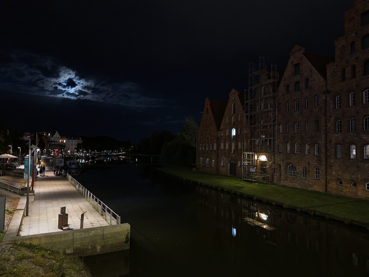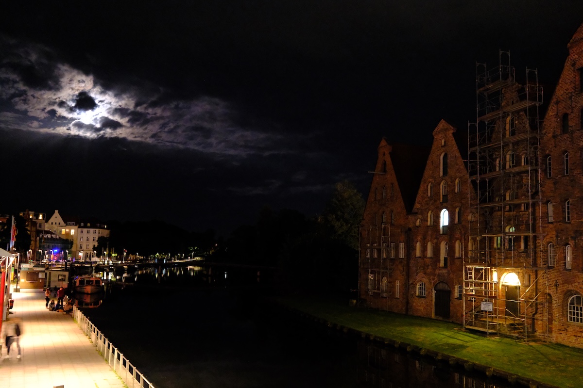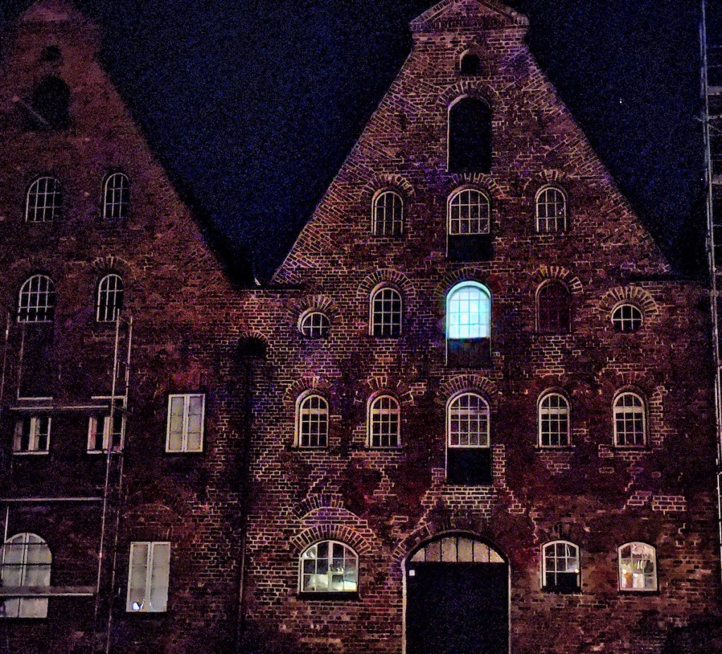 In den Abendstunden am Salzspeicherfenster in Lübeck wird zum Gedenken an den Film „Nosferatu“ von 1922 eine besondere Installation gezeigt: Ab Einbruch der Dunkelheit wird das Nosferatu-Fenster im historischen Salzspeicher beleuchtet, um eine der legendärsten Filmszenen neu erlebbar zu machen. Die eindrucksvolle Lichtinstallation führte mich an den originalen Drehort und macht die Atmosphäre des Stummfilmklassikers im nächtlichen Lübeck nachfühlbar. Die Sache zu fotografieren gestaltete sich als kompiliert wegen der Hell-Dunkel-Kontraste in später Nacht.