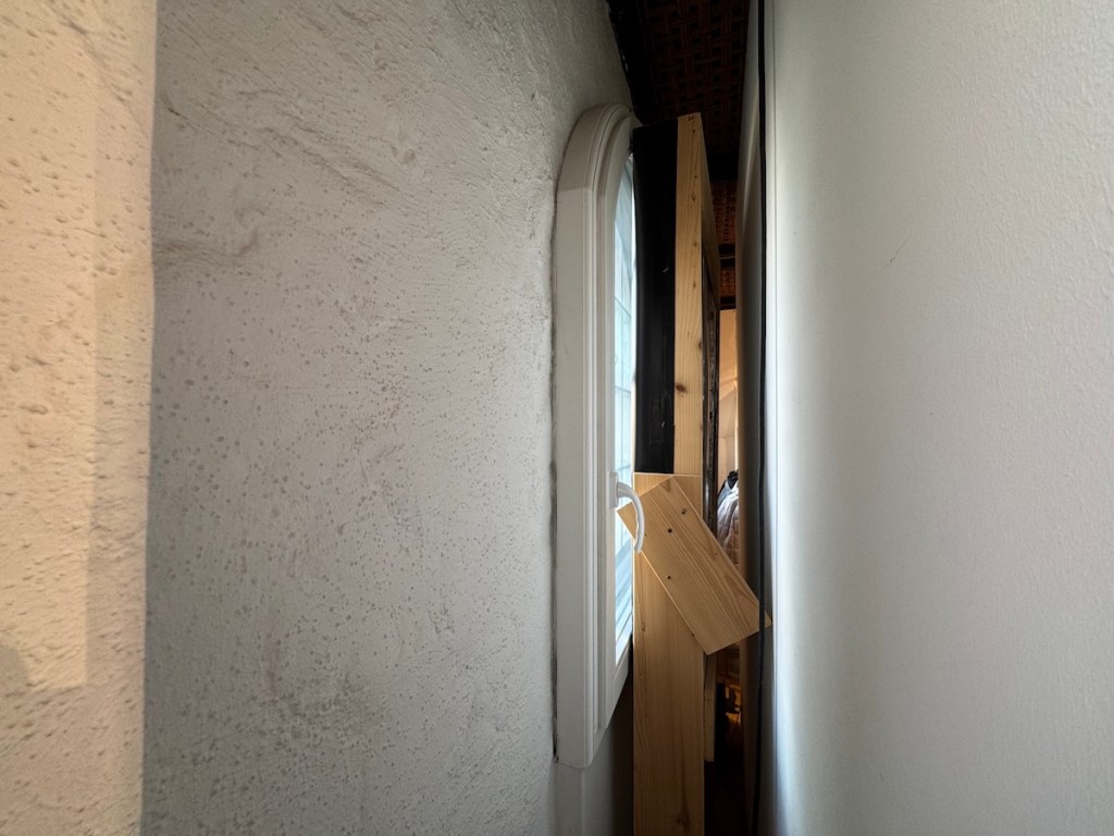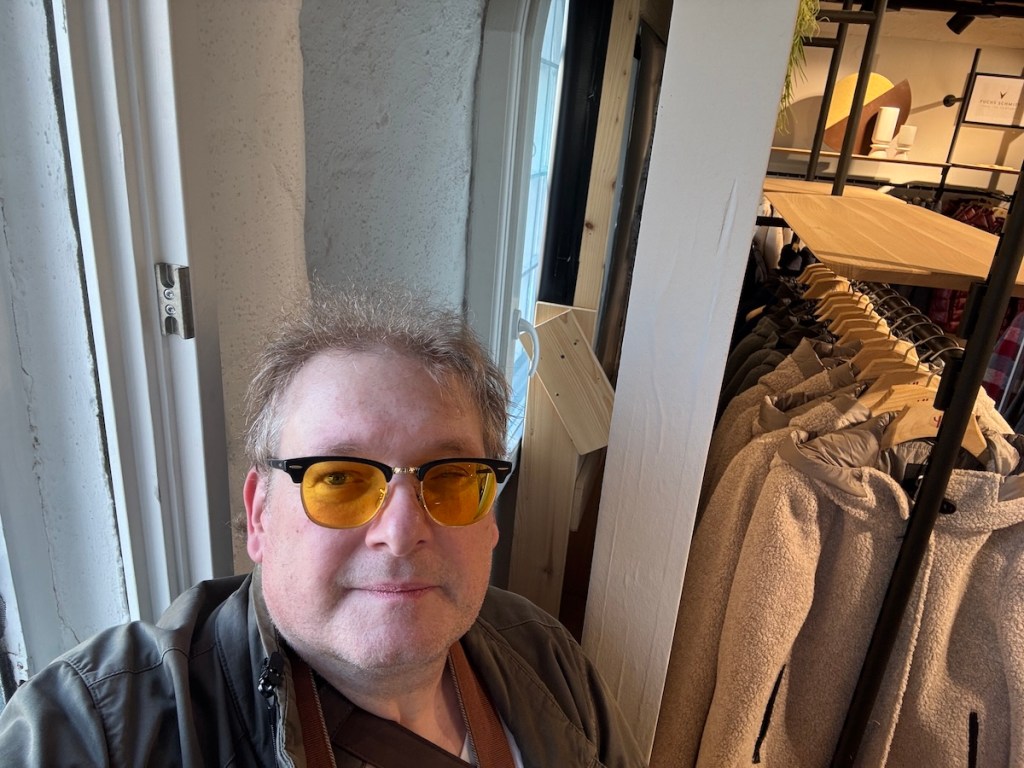 Bei Tage ist Salzspeicherfenster aber das Modegeschäft Heick & Schmaltz. Während die Gattin Kleidung probierte, zeigte mir eine freundliche Verkäufer das Nosferatu-Fenster. Hinter der engen Installation befand sich eine Wand und dafür ein Ständer mit Damenjacken. Ich machte ein paar Fotos und Videos von der Enge und der Holzkonstruktion zur Verwunderung einiger Damen, die auch an der Damenmode interessiert waren.