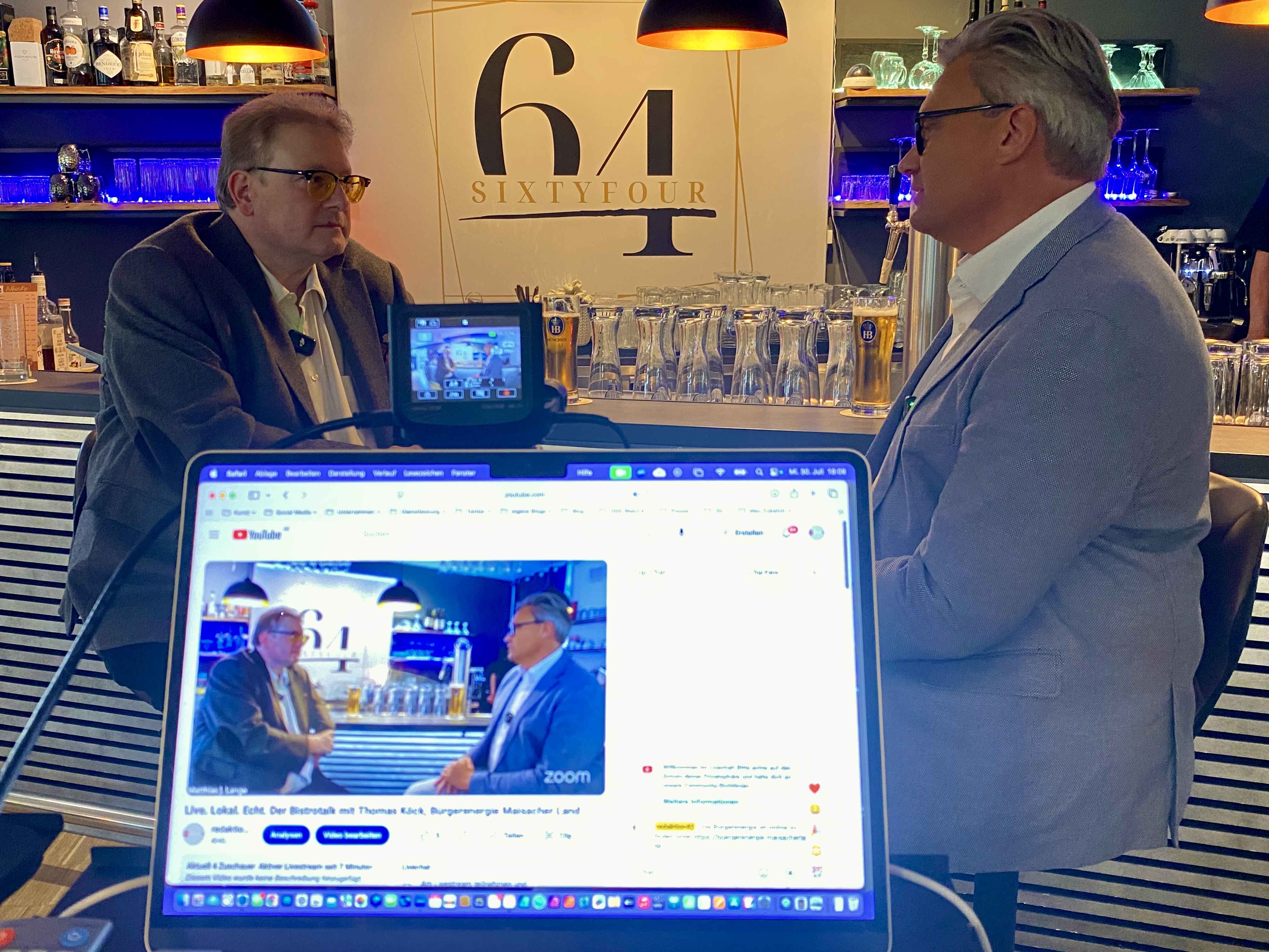 Auch beruflich kann ich vom SixtyFour profitieren – ich nutze die Theke für ein lokales Streaming-Format und experimentiere damit: Live. Lokal. Echt. Der Bistrotalk auf YouTube. Ich lade interessante Persönlichkeiten aus der Gemeinde zu einem einstündigen Videointerview ein und übertrage diesen Talk live. Zwei Bistrotalks haben wir bereits durchgeführt, der nächste folgt am 10. September mit dem Maisacher Feuerwehrkommandanten Andreas Müller. Einfach mal etwas anderes als klassische Diskussionsveranstaltungen auf lokaler Ebene – die Klickzahlen sehen gut aus.