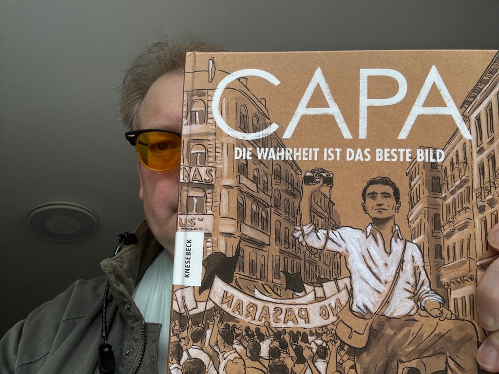 Ich habe eine erfolgreiche Online-Seminarreihe zum Thema politische Fotografie und Fotografen und natürlich wurde Reihe mit dem wichtigsten Krisenfotografen Robert Capa eröffnet. Nun bekam ich die interessante Grafic Novel “Capa – Die Wahrheit ist das beste Bild” von Florent Silloray (Originaltitel Capa – l’Étoile filante) in die Hände.