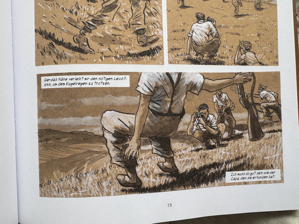 Außerdem bleiben wesentliche biografische Hintergründe unerwähnt – etwa Capas frühes Exil, seine politische Sozialisation oder weitere kontextuelle Details, die eine fundiertere Einordnung ermöglicht hätten. Die grafische Umsetzung ist gelungen, das Lettering jedoch teils beengt oder formal unausgewogen, und es finden sich kleinere textliche oder grafische Ungenauigkeiten.