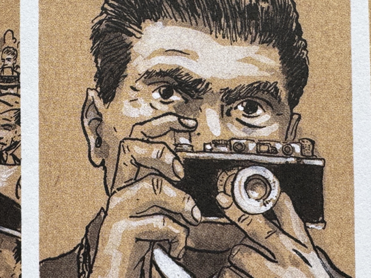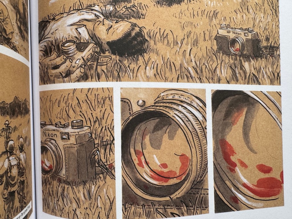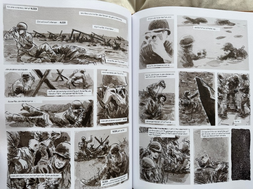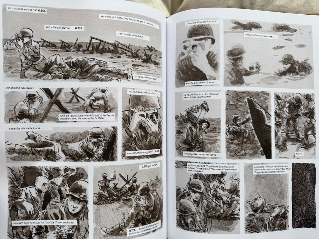 Die Illustrationen zeigen ihn direkt in den Momenten, in denen er seine berühmten Fotos macht – etwa den berühmten „Tod eines loyalistischen Milizionärs“ während des Spanischen Bürgerkriegs oder die Landung in der Normandie am D-Day – und bieten so eine originelle Perspektive auf die Entstehungsgeschichte der Bilder.