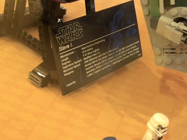 Die Maße des neuen Fliegers sind 20cm x 45cm x 37cm. Der Preis liegt bei 199 Euro. Interessant ist dieses Mal, dass die Slave I sehr stabil gebaut ist und trotz Sammlerstück zum Spielen geeignet ist. Der Block mit Han Solo wird elegant im Lageraum des Fliegers verstaut, ein paar Waffen wurden versteckt. Schön gestatlet ist auch die Unterseite des Fliegers. Viele technische Details sind zu sehen, unter anderem auch weil der Flieger auf seiner Halterung aufrecht steht. Wobei im LEGO Store in Pasing war der Flieger meines Erachtens falsch aufgestellt wurde – die Seitenansicht wäre eleganter.