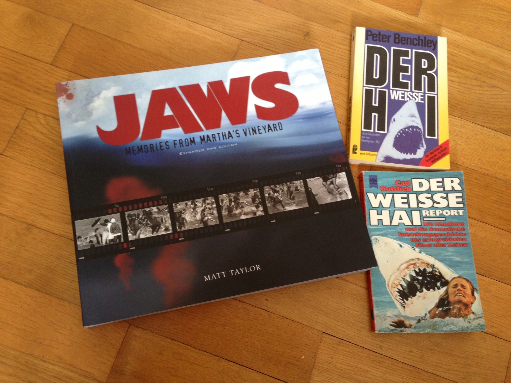 Als Filmfan empfehle ich zwei Bücher. Das eine, der weiße Hai Report von Carl Gottlieb, lag jahrelang im Archiv und berichtet als Fanbuch über die Dreharbeiten zum Film. Gottlieb ist Drehbuch-Autor des Films und spielt auch eine kleine Rolle als Lokalreporter im Film. Es gibt aus erster Hand nette Geschichten hinter den Kulissen und schönen Insiderkram. Es macht Spaß, das Buch zu lesen. Ausführlich werden die technischen Probleme mit dem Hai Bruce geschildert. Heute würde Hollywood so einen Autoren vom Hof jagen, wenn er von solchen Pannen berichtet, aber die siebziger Jahre waren da doch offener. Es scheint, dass die Dreharbeiten unter keinen guten Stern standen. Sehr gut ist die Auflistung aller Beteiligten des Films. Die zahlreichen Schwarweiß-Fotos stammen von aus der Universal Studio-Kollektion.
