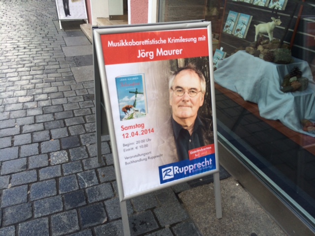 Das Krimi-Kabarettprogramm von Jörg Maurer ist Kult. Die Buchhandlung ist die Event-Location. Die Schaufenster dienen als Werbefläche für das Buch. Stopper vor der Buchhandlung machen zudem auf die Veranstaltung aufmerksam.