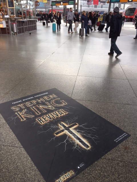 Auf dem Weg zum Zug laufe ich über die Werbung von Revival. Auf einem großen Bodenplakaten ist das Buchcover mit großen Lettern abgebildet: Packend, mysteriös, elektrisierend und dann das fette Buchcover. Und es gibt einen kleinen Hinweis, dass es das Buch als eBook gibt.