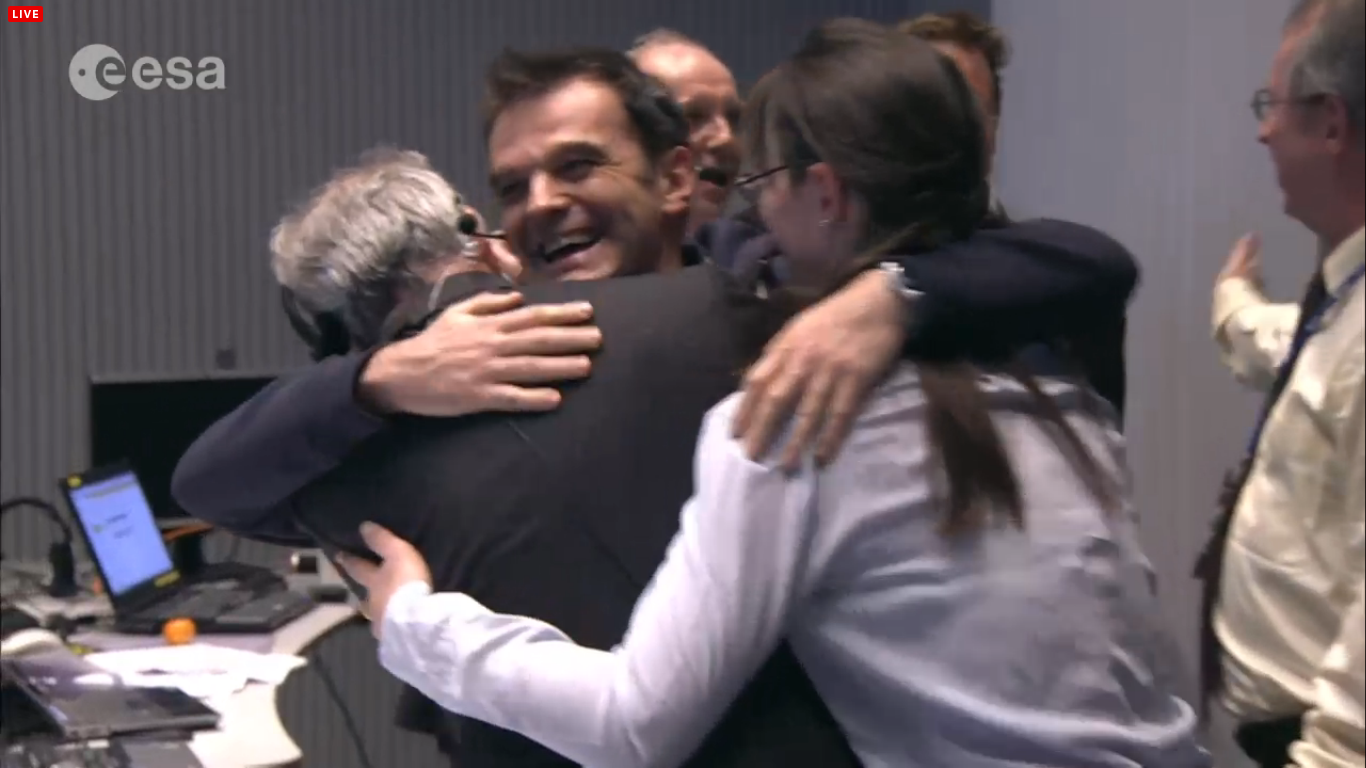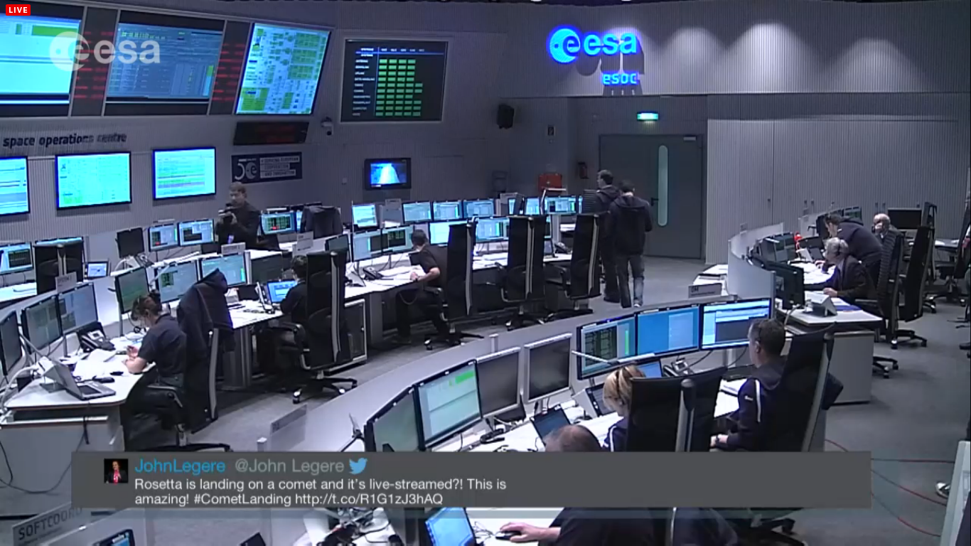 Sehr gerne wäre ich live vor Ort gewesen und eine Geschichte für gemacht. So war ich eben zu Hause am Esstisch und beobachte von dort, wie Geschichte gemacht wurde. Wenn ich ehrlich bin, sah ich die meiste Zeit nur Menschen in einem nüchternen Kontrollräumen. Die Herrschaften arbeiteten und ich sah vor dem MacBook und schaute zu, ich beobachtete den ESA-Stream und gleichzeitig Twitter mit dem Hashtag #cometlanding. Ich sah Wissenschaftler in Hoodies, T-Shirts und zerknitterten Hemden, die Menschheits- und Wissenschaftsgeschichte schrieben, ohne Show- und Starallüren. Nur als einmal ein Amerikaner von der NASA eine motivierende Ansprache hielt, kam ein wenig Pathos auf. Immer wieder gab es Interviews und Statements und Moderatorin Monika Jones machte einen guten Job, nicht übertrieben, sondern serös, irgendwie europäisch.