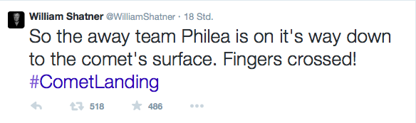 Der Blechkasten ist 500 Millionen Kilometer entfernt und wir bekommen hier auf der Erde die Signale, Daten, Bilder. Und als sich Captain Kirk, – im Grunde war es William Shatner – in die Twitter-Diskussion einschaltete, lachte ich begeistert auf. Dessen Tweets brachte den gewissen Promi-Faktor, den es auch brauchte.