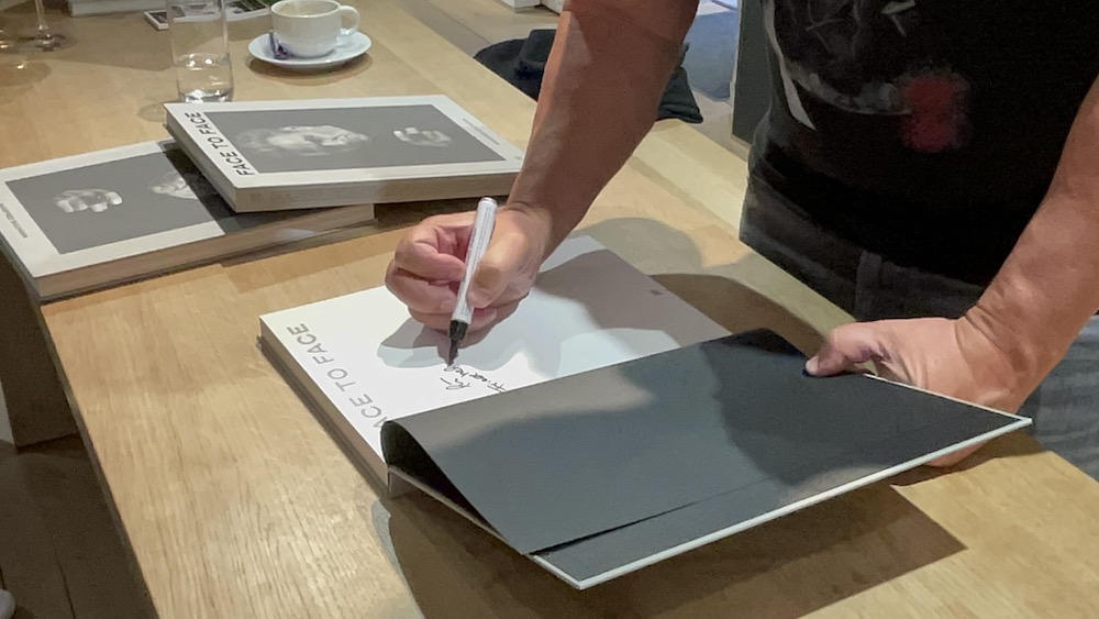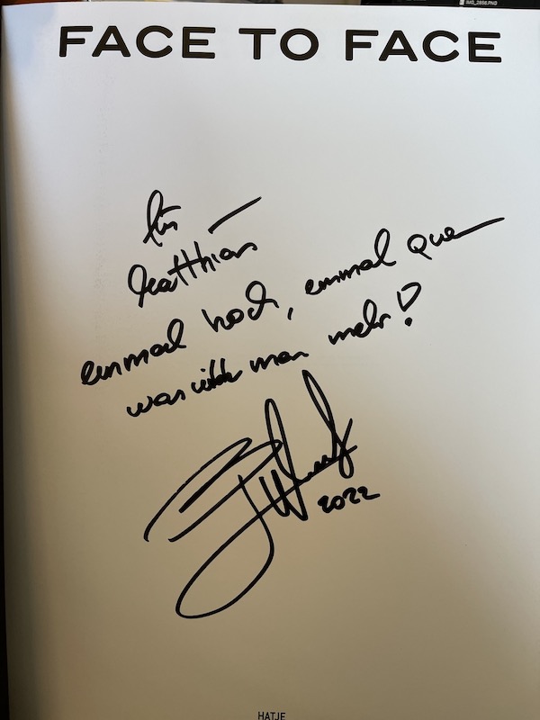 Einige der Stars aus Face to Face kenne ich, einige sind mir unbekannt, aber die fotografische Handschrift Baumanns tragen sie alle. Sie sind nicht so inszeniert wie die Fotos seiner großen Kollegin Annie Leibovitz, erinnern mich eher an Paul Ripke. Ich kaufte das Buch und ließ es mir mit dem alten Fotografen-Spruch signieren: „Einmal hoch, einmal quer, was will man mehr.“