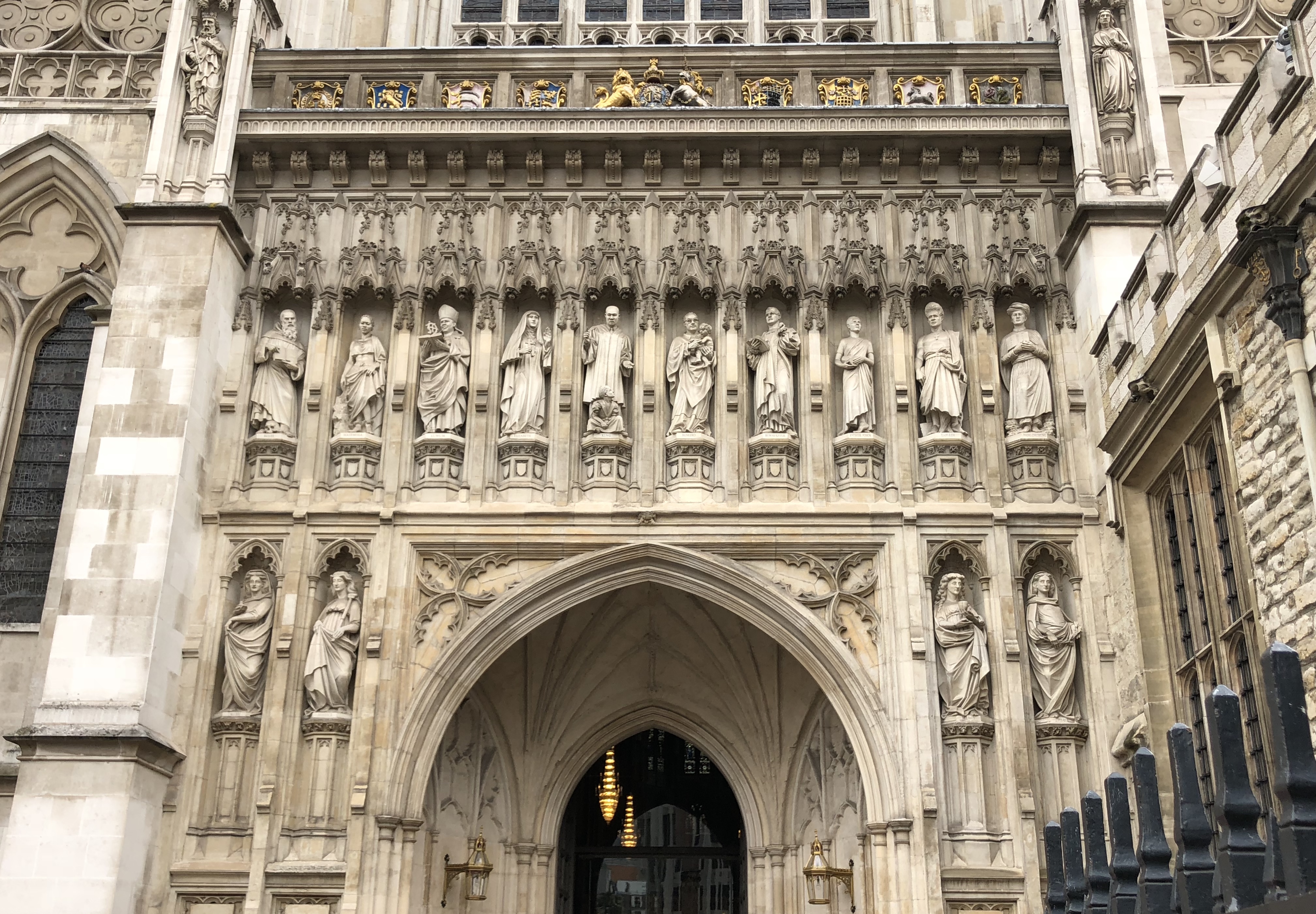 An einem Ausgang entdeckte ich dabei die Märtyrer des 20. Jahrhunderts und versuchte sie zu erkennen. Ein paar kannte ich, viele sind mir unbekannt. Über dem Ausgangsportal stehen zehn Figuren in Stein gehauen. Links und rechts neben der gotischen Tür stehen symbolisch Wahrheit (truth), Gerechtigkeit (Justice) sowie Gnade (Mercy) und Frieden (Peace).