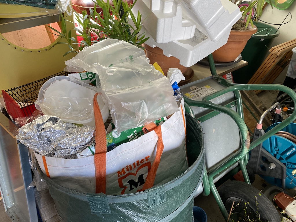 Wenn aber eine vierköpfige Familie und mein isoliertes Elternpaar rund zwei Wochen zu Hause sind, dann fällt Müll, Verzeihung Wertstoffe, im großen Stil an. Papier, Flaschen, Weißblech entsorge ich täglich an den Kleinen Wertstoffhöfe, die zeitweise wüst aussahen. Aber der Containerdienst hatte die Sache im Griff. Dennoch türmen sich in der Garage Tüten mit Plastik, Alu und Verbundstoffen, die auf ihre Entsorgung am Großen Wertstoffhof in Maisach warten. Auch ein paar große Stücke Styropor freuen sich, dass sie dem Recyclingsprozess zugeführt werden dürfen.