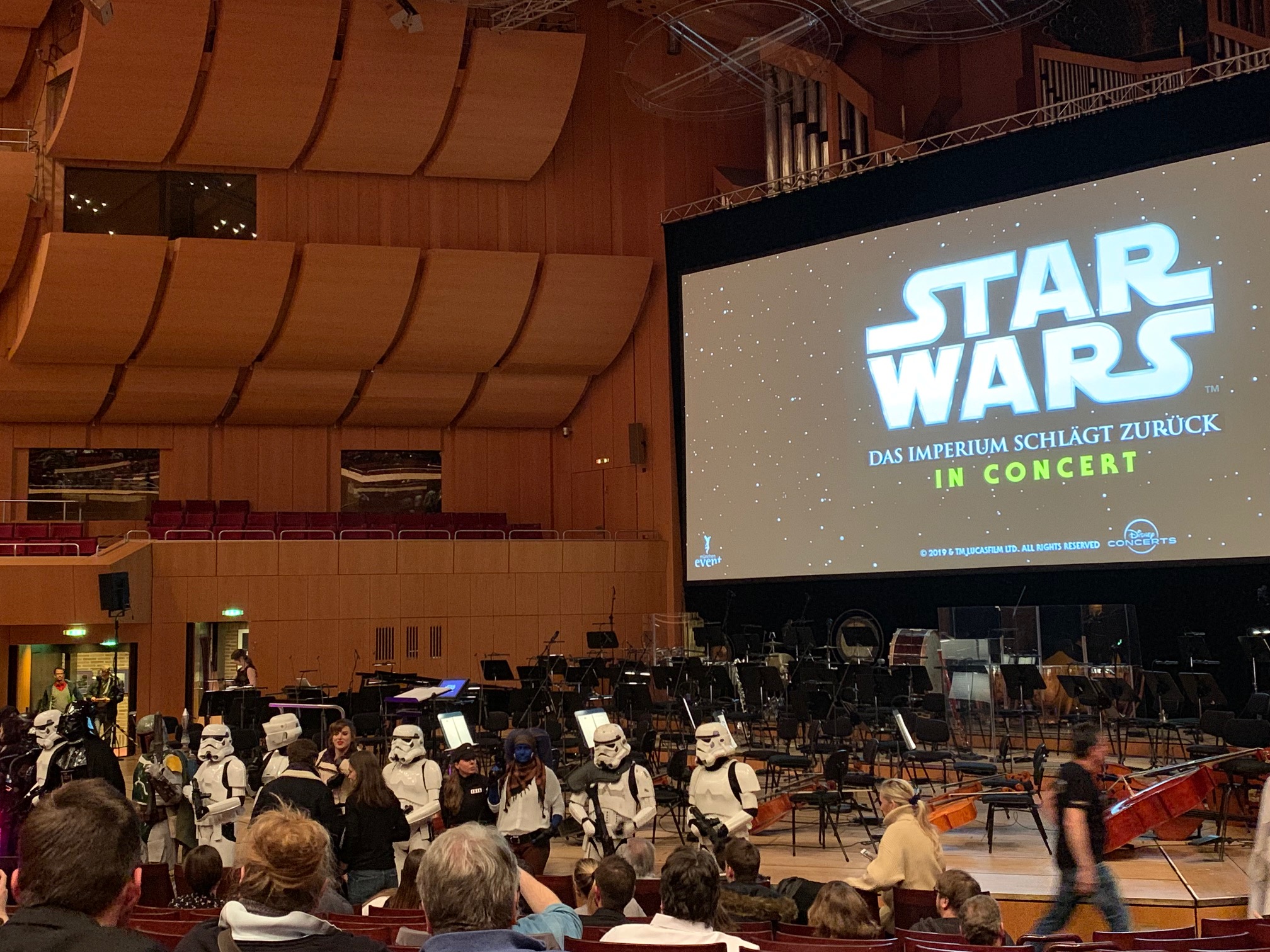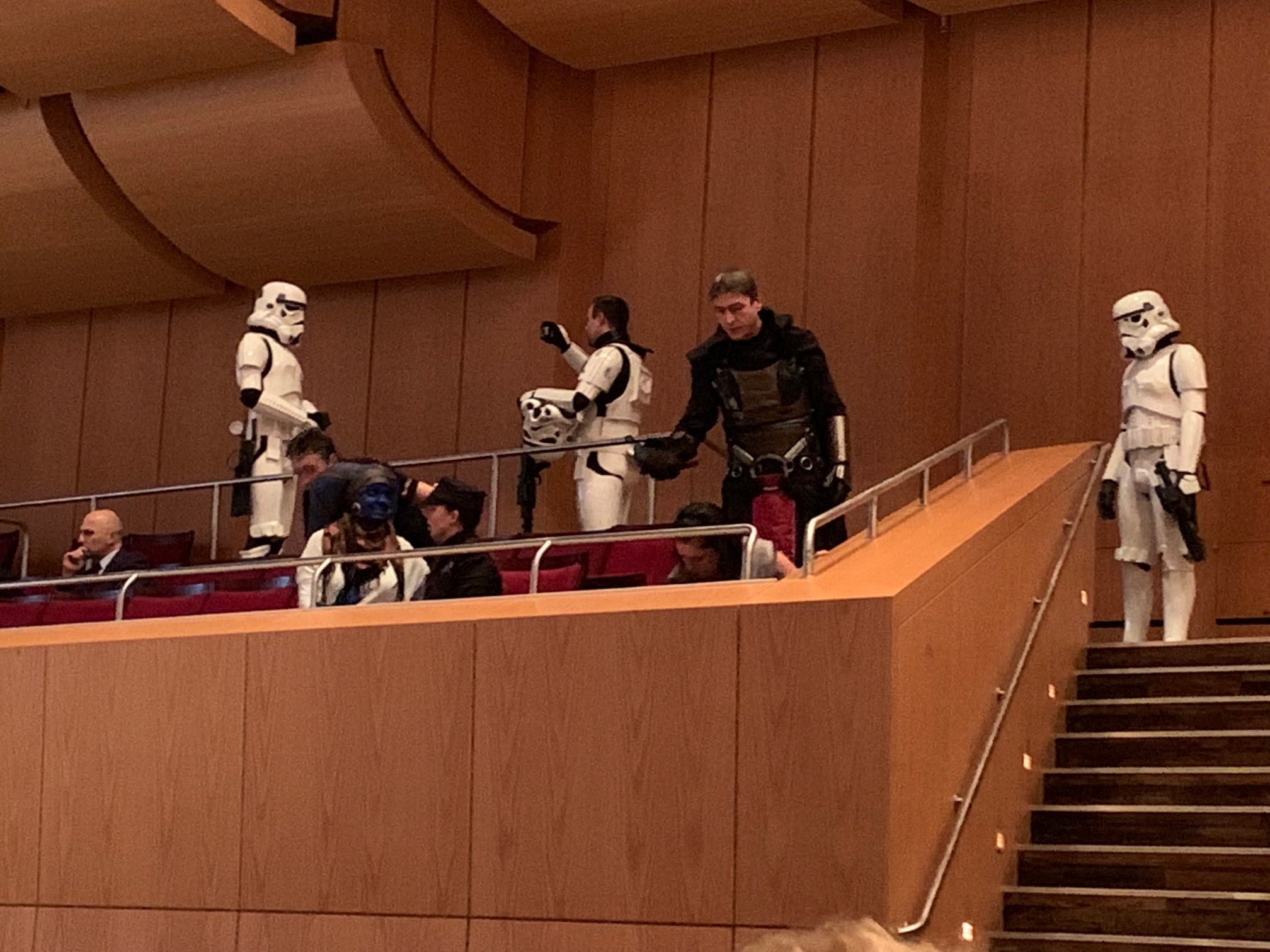 Platz genommen in der Philharmonie und zu Beginn zogen die kostümierten Fans vor die Bühne zum nächsten Fototermin. Später nahmen sie auf den Seitenrängen Platz und verfolgten das Konzert. Natürlich hatten auch Sturmtruppen ihr Smartphone dabei und schossen Erinnerungsfotos von dem Auftritt nach dem Motto: Auch eine Sturmtruppen braucht eine Erinnerung – aber waren das nicht Klone?