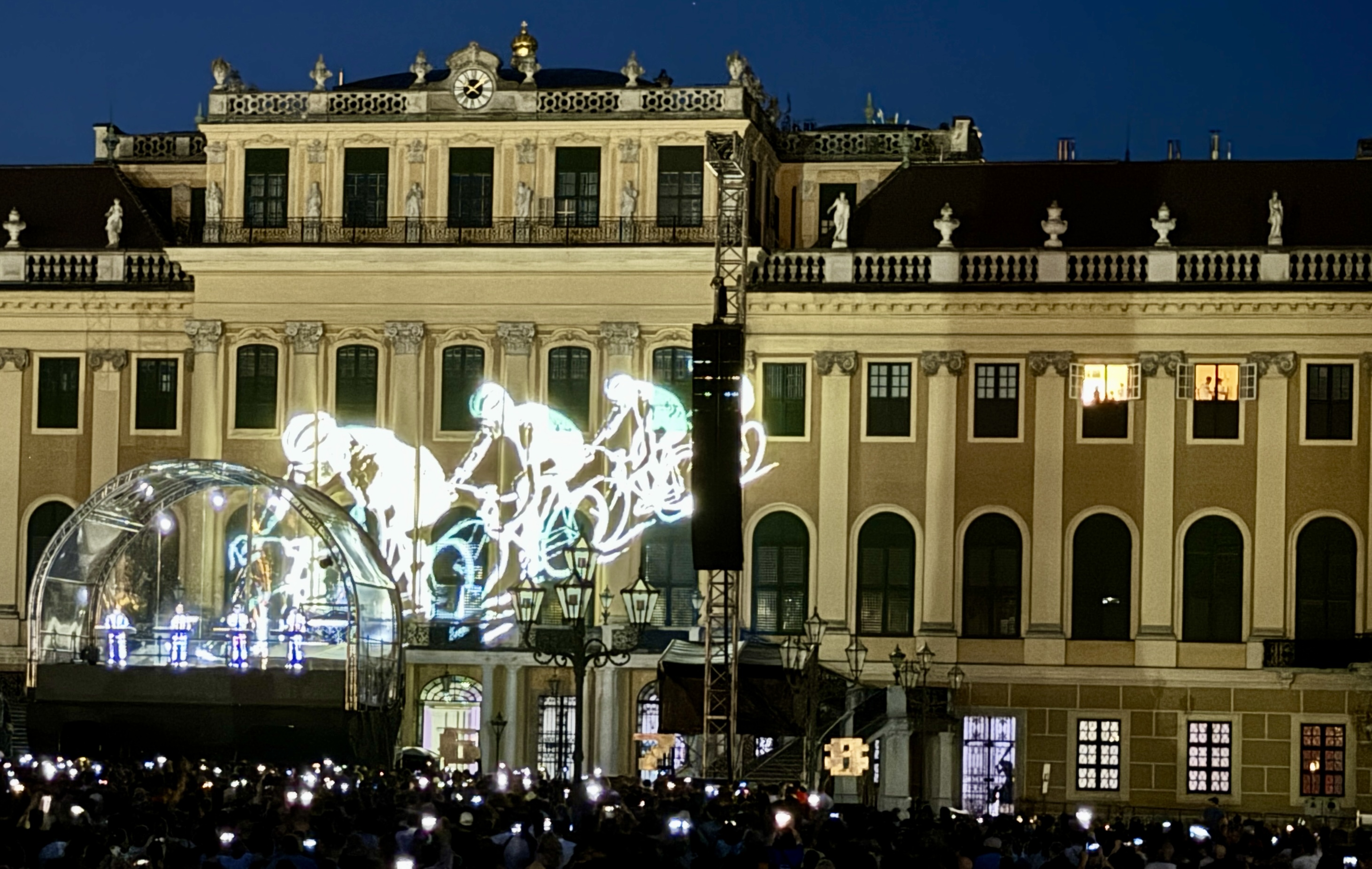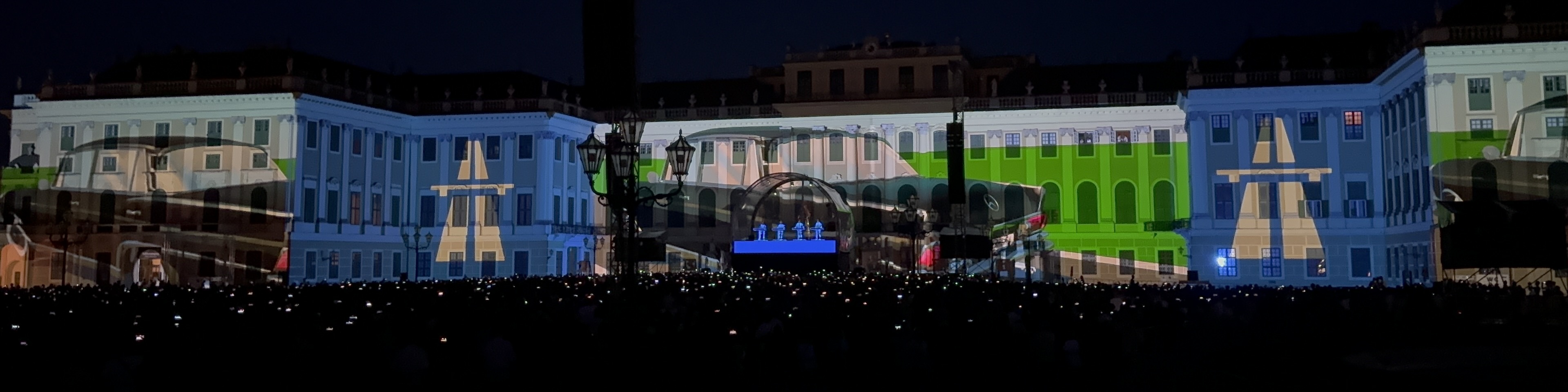 Der Schlossplatz vibriert. „Computerwelt“ und „Autobahn“ – Hymnen einer digitalisierten Gesellschaft – entfalten ihre hypnotische Wirkung. Die Menge wiegt sich im Takt, von den ersten Reihen bis zu den hinteren Stehplätzen. Die Projektionen, mal minimalistisch, mal verspielt, erzählen Geschichten von Datenströmen, urbaner Mobilität und dem ewigen Traum vom Fortschritt. Es ist, als würde der Puls der Stadt mit dem der Musik verschmelzen. Erinnerungen kommen hoch, als Alexander Gerst einmal von der ISS zugeschaltet wurde. Was war das für ein geschichtsträchtiger Moment! So etwas lässt sich nicht toppen. Ausfallende Lampen am Anzug sind vielleicht ein Zeichen, dass Ralf Hütter vielleicht mal was neues auflegen sollte.