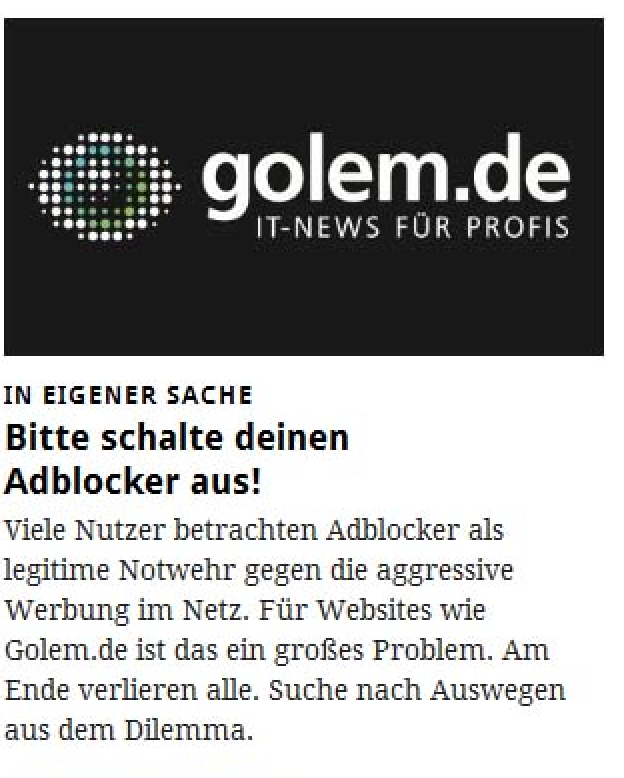 Trotz des digitalen Zeitalters und der Tatsache, dass laut BITKOM fast zwei Drittel der Deutschen online shoppen, empfinden 62 Prozent der Befragten Werbung im WorldWideWeb als ärgerlich, 34 Prozent als überall verteilt oder 31 Prozent als störend. Die Computerwebsite Golem beispielsweise schaltete gegen Adblocker einen Aufruf. Nur wenn Werbung ausgliefert werden kann, dann kann ein journalistischer Service erhalten bleiben.