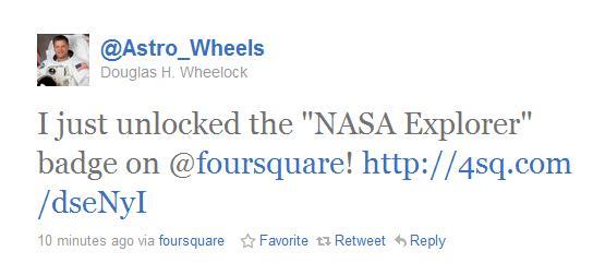 Nun der absolute Hammer: Standortbezogene Dienste haben einen großen Schritt gemacht. Der Astronaut Doug Wheelock befindet sich derzeit im Weltall auf einer Nase-Mission. Er twitterte den Satz: „I just unlocked the “NASA Explorer Badge” und twitterte seinen Standort Foursquare. Ist das cool? Die erste Location eines standortbezogenen Dienstes im Weltall.