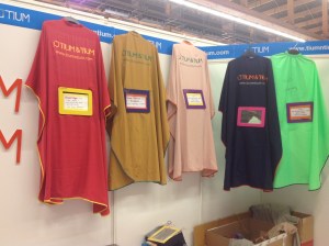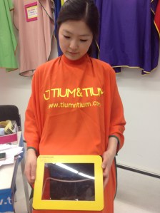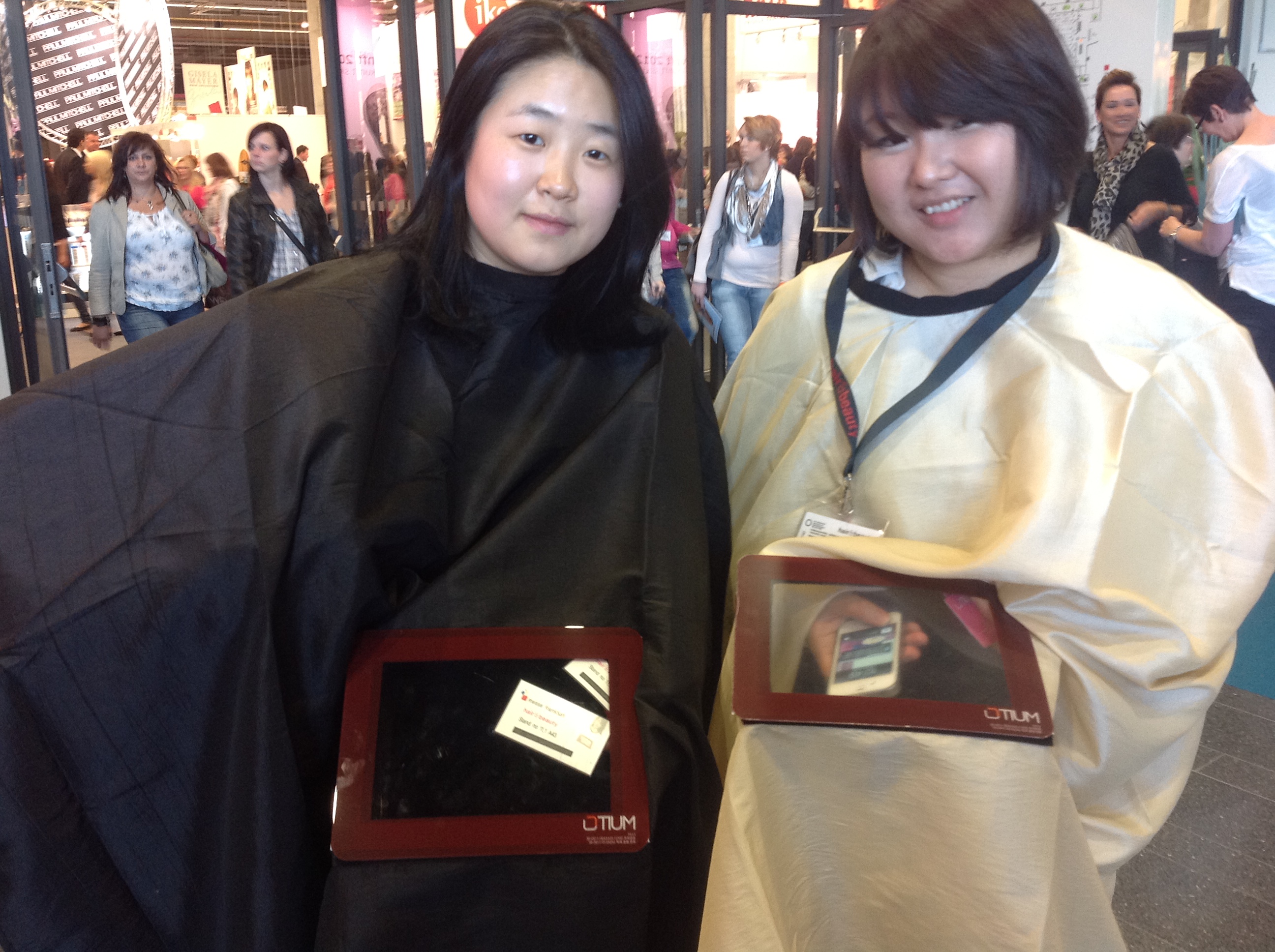 Jetzt habe ich die Lösung: Den Friseurumhang Smart Cape oder auch Otium & Tium mit Sichtfenster fürs iPad oder iPhone. An einem kleinen Stand auf der Hair & Beauty habe ich diese Idee aus Korea gefunden. Einen Plastikumhang mit Fenster. Durch einen Klappmechanismus kann das iPad bequem auf dem Schoß ausprobiert werden. Die Idee fand ich super und musste es auch gleich ausprobieren. Ich wählte einen Umgang im neutralen Beige-Ton. Buntere, wildere Farben sollen in der Saison noch erscheinen. Die Firma heißt tiumntium und Jiyeon Seo ihr Chef. Der Spaß hat mich 10 Euro gekostet und meine Zeit beim Friseur kann ich nun auch mit meinem iPad verbringen – großartig.