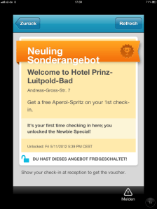 Aber es ging noch weiter als ich nochmals auf Foursquare am iPhone blickte. Ich bekam für mein Einchecken und das Teilen der Information einen Aperol Spritz auf Kosten des Hauses. Ich sollte mich einfach bei der Rezeption melden und erhielt anschließend in der Bar den kostenlosen Modedrink. Hab ich gleich gemacht: Auf Teilen in Facebook und Twitter gedrückt, meine Freunde bekamen mit, in welchem schönen Hotel ich nächtigte und alle waren zufrieden: Der Hotelier bekam kostenlose Imagewerbung, ich bekam einen kostenlosen Drink und meine Freunde bekamen die kostenlose Information über ein Hotel. Gleich darauf kam in Twitter eine DM von einer Twitterfreundschaft, in der ich nach der Adresse des Hotels gefragt wurde. An diesem kleinen Beispiel aus der Hotelbranche sehe ich: Empfehlungsmarketing funktioniert.