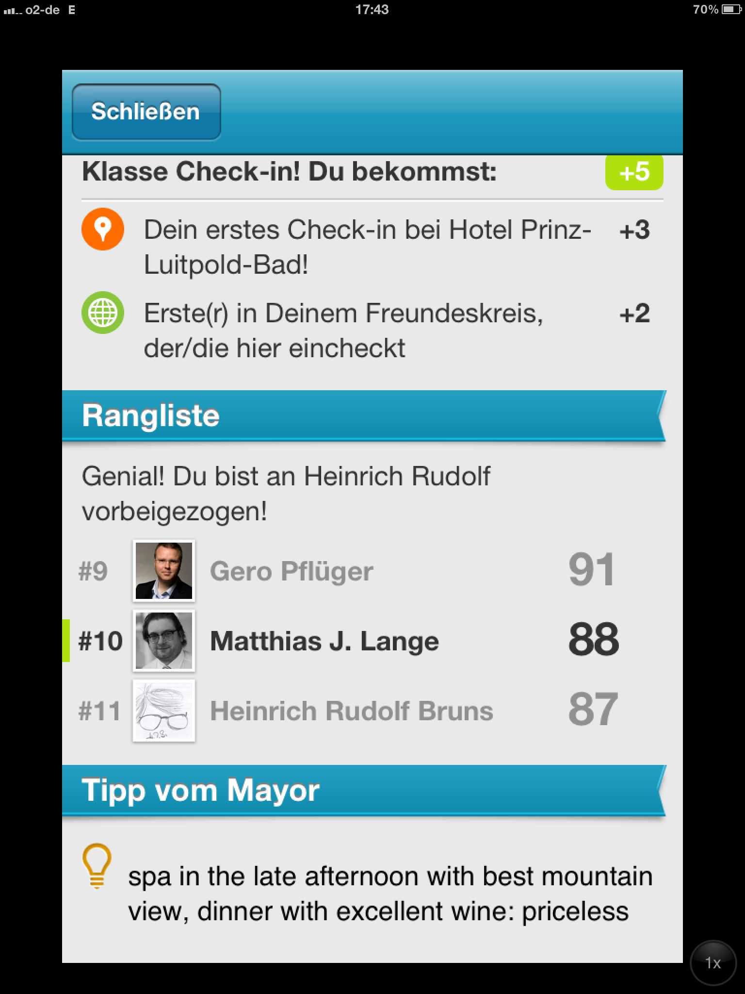 Nehmen wir als Beispiel Foursquare. Bei diesem geobasierte Dienst checke ich mit meinem iPhone an verschiedenen Orten ein und bekomme dafür Punkte, die in ein Ranking mit meinen Freunden einfließen. Wenn ich öfters an einem Ort einchecke, habe ich zudem die Chance Bürgermeister/Mayor zu werden. Kehre ich an verschiedenen Orten wie beispielsweise Flughäfen ein, erhalte ich ein Abzeichen. Alles ist natürlich mit Facebook und Twitter gekoppelt, damit meine Freunde auch wissen, welch toller Hecht ich bin. Das macht Spaß, der Wettbewerb bringt Motivation und dient der Vernetzung. Ein anderer geobasierter Dienst war Gowalla. Das war zu kompliziert und ist nach seinem Kauf durch Facebook in der Versenkung verschwunden.