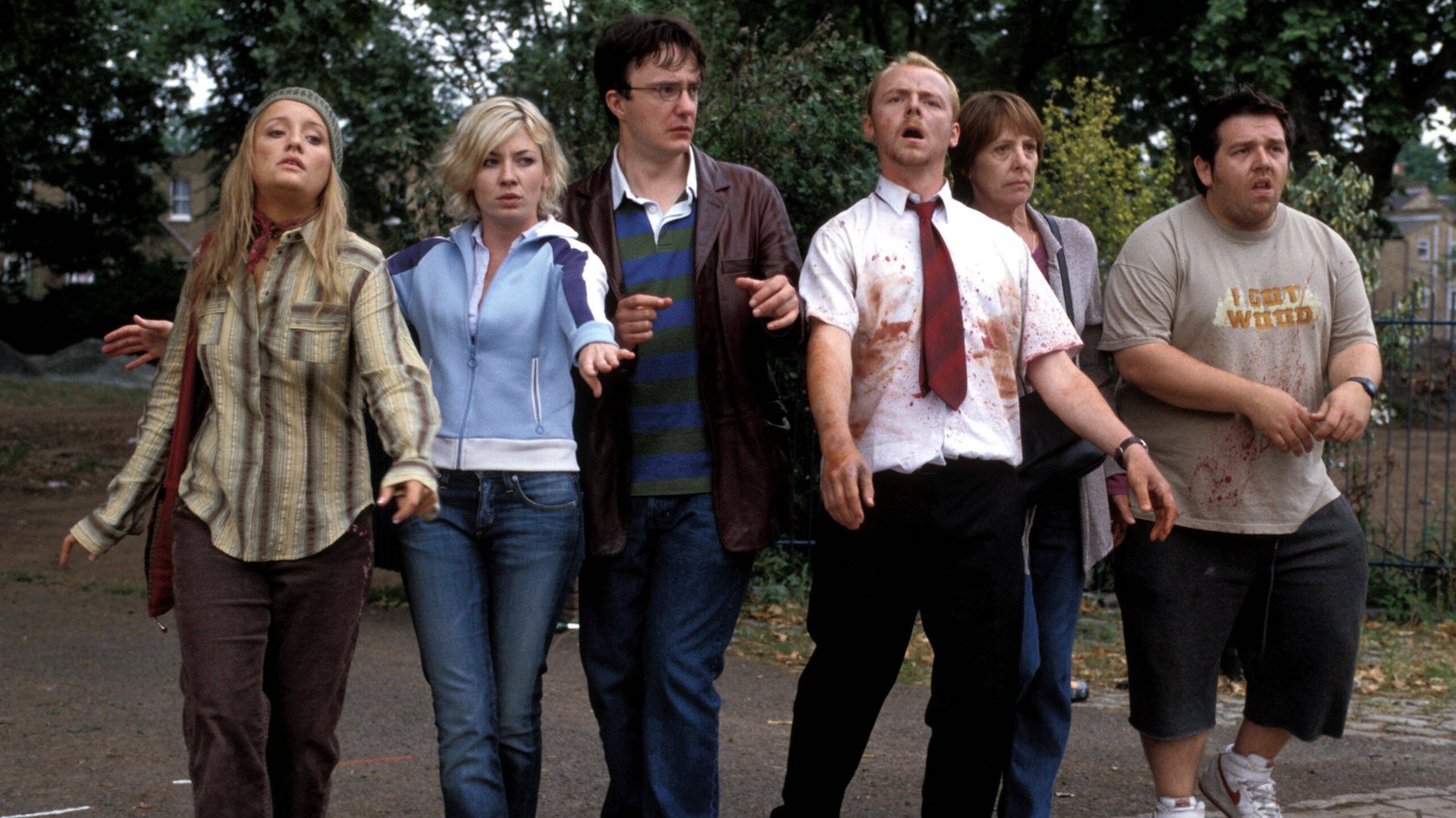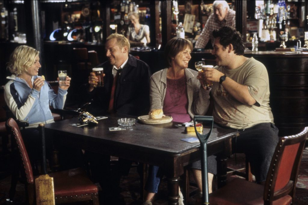 Dylan Moran, Kate Ashfield, Lucy Davis, Nick Frost, Penelope Wilton and Simon Pegg in Shaun of the Dead.