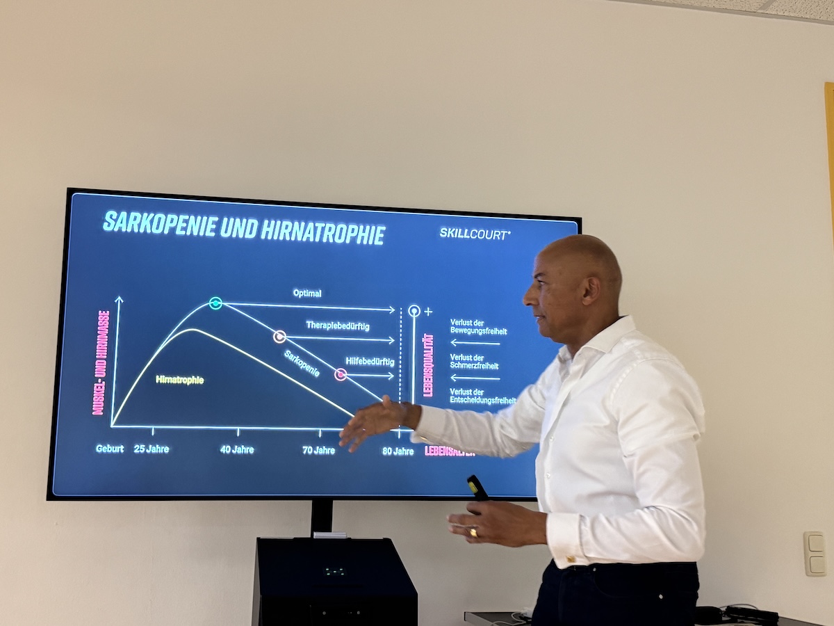 Edgar Itt, Bronzegewinner von Seoul 1988 über die 4×400-Meter-Staffel und heute europäischer Botschafter von Skillcourt, führte lebendig in das Thema „Vigomotorik“ ein – das Zusammenspiel von visuellen, kognitiven und motorischen Prozessen. Er machte deutlich, warum modernes Training das Gehirn immer mitdenken muss: Sehen, Verarbeiten, Handeln – wer sich sicher bewegen will, braucht schnelle, präzise Entscheidungen und eine gute Ansteuerung der Muskulatur. Anhand prägnanter Alltags- und Sportbeispiele spannte Itt den Bogen von Sturzprävention und Verkehrssicherheit bis hin zum Leistungs- und Rehasport. Zugleich erinnerte er an die Bedeutung von Muskelaufbau und geistiger Aktivität über die Lebensspanne hinweg – nicht als „Belustigung“, sondern als kontinuierliches Training. Seinen kompletten Vortrag gibt es hier.