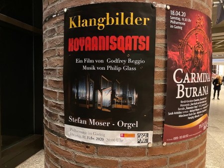 Durch Koyaanisqatsi entdeckte ich als Jugendlicher die Minimal Music von Glass, der für mich bis dahin nur in Klassik gemacht hat. Glass war durch den Film für mich als besonderer Filmmusikkomponist etabliert. Sein Werk zu Dracula höre ich immer wieder gerne. Die Musik zu Koyaanisqatsi war für mich hypnotisch und ich ertappte mich, Als ich aus den Gasteig ging und nach Hause fuhr und immer wieder den Hopi-Gesang Koyaanisqatsi vor mich hin sang. Die Wirkung der Musik ist enorm und in Verbindung zu den Bilder beamt sie einen weg. Einen ähnlichen Effekt hatte ich bei 2001: Odyssee im Weltraum als es zum Ende hin psychedelisch wurde und ich Atmosphères von György Ligeti für mich entdeckte. Die Musik in Verbindung mit den Bildern in Koyaanisqatsi war ein Rausch. Wie in Trance saugte ich das Filmkunstwerk von Godfrey Reggio auf. Als die Endcredits über die Leinwand liefen, erwachte ich aus diesem Sog an Bilder und Tönen. Das hervorragende Orgelspiel von Stefan Moser leistete dazu einen gehörigen Beitrag.