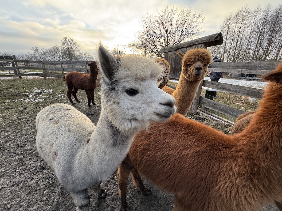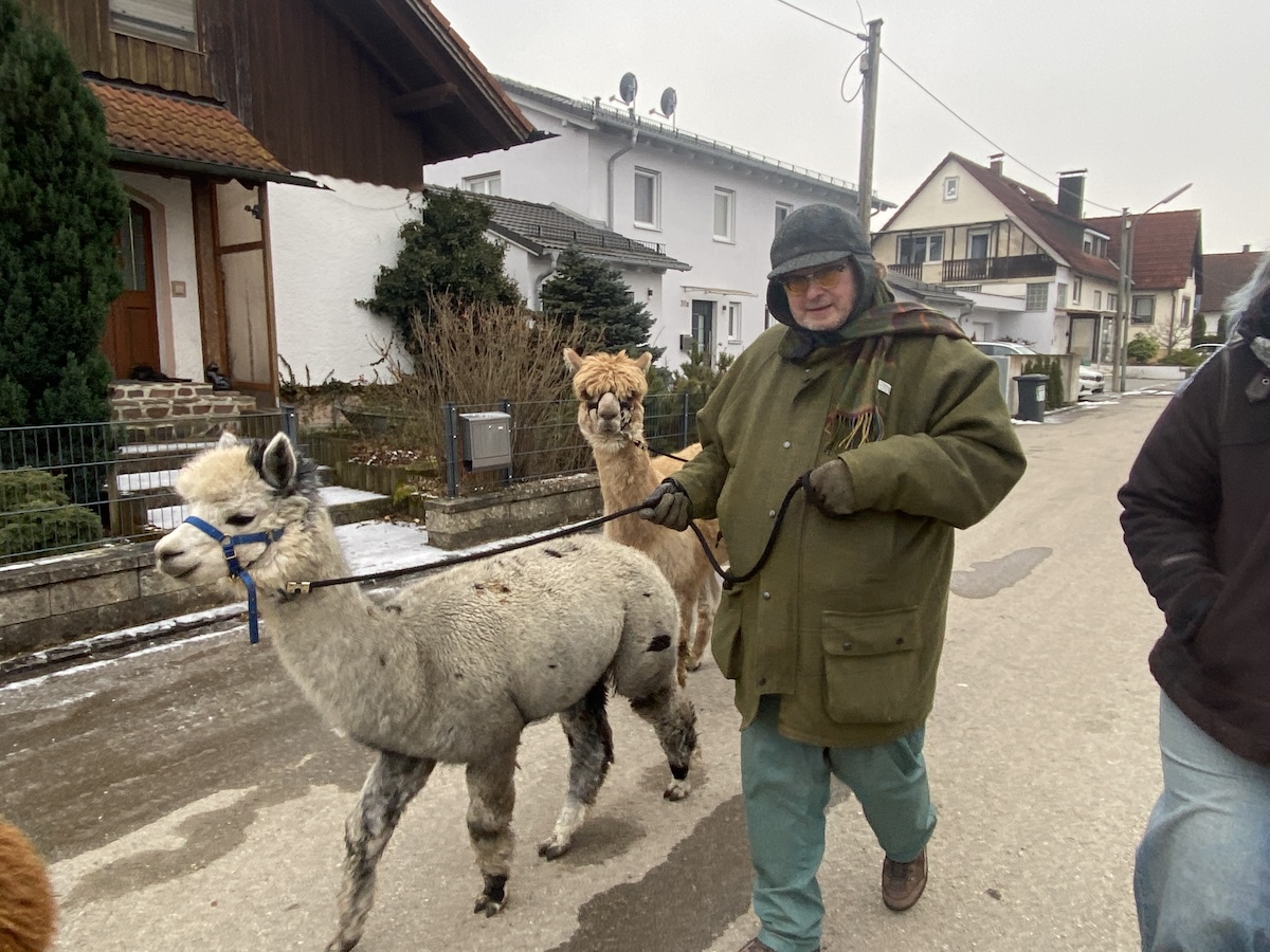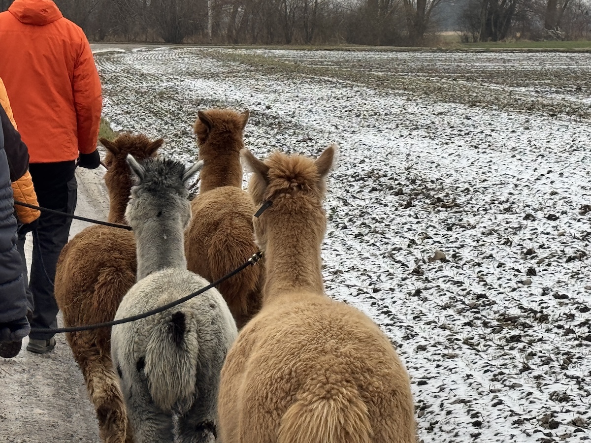 Fast zwei Stunden bin ich abwechselnd mit Anton und Ludwig durch die Kälte gelaufen. Anton und Ludwig sind ganz brav neben mir her getrottet, während ich mit ihnen gesprochen habe. Geantwortet haben sie nicht, denn Anton und Ludwig sind Alpakas.