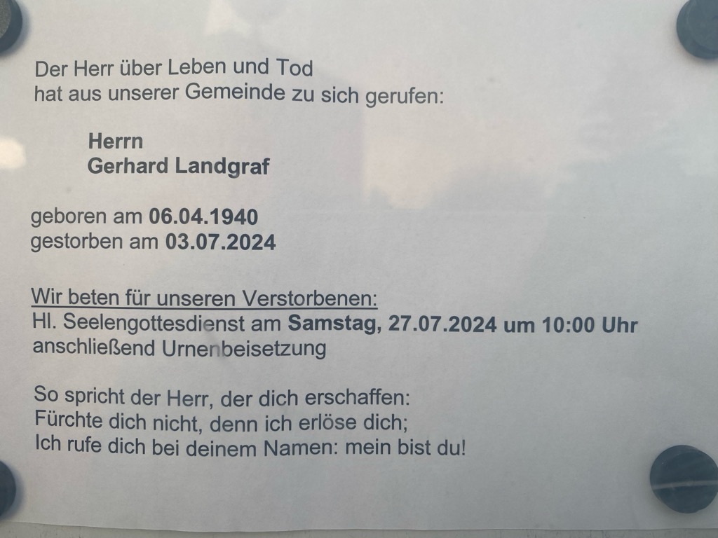 Das letzte Mal traf ich Landgraf im Frühjahr auf einer Versammlung und wir hielten ein kleines Schwätzchen, scherzen herum und freuten uns. Landgraf war mit seinen 84 Jahren gut drauf. Wir beide sind Mitglied der Aktion PiT Togohilfe, eine Organisation, die Landgraf seit Jahren unterstützte. Und wenn nun sein Gedenkgottesdienst ist, dann erinnere ich mich an eine andere Beerdigung, wo Landgraf bei mir einen Stein im Brett hatte und ich ihm großen Respekt zolle.
