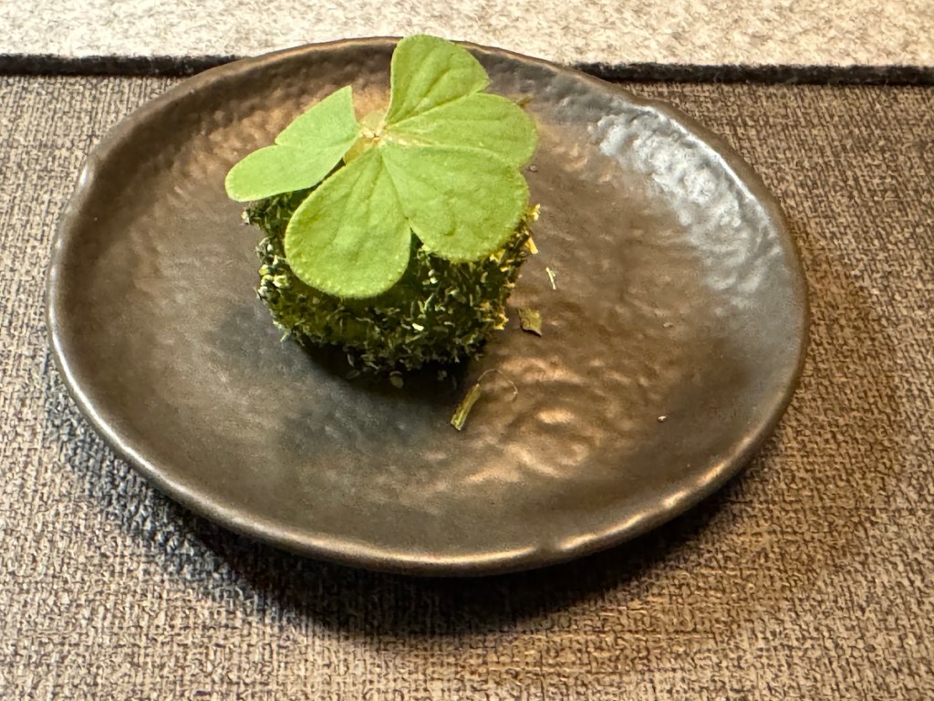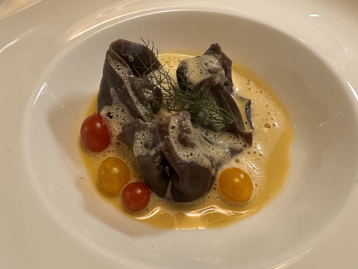 Mokka-Ravioli mit Lamm, Erbse und Minze. Dazu 2019 – Goruli Mitsvane Réserve Royale