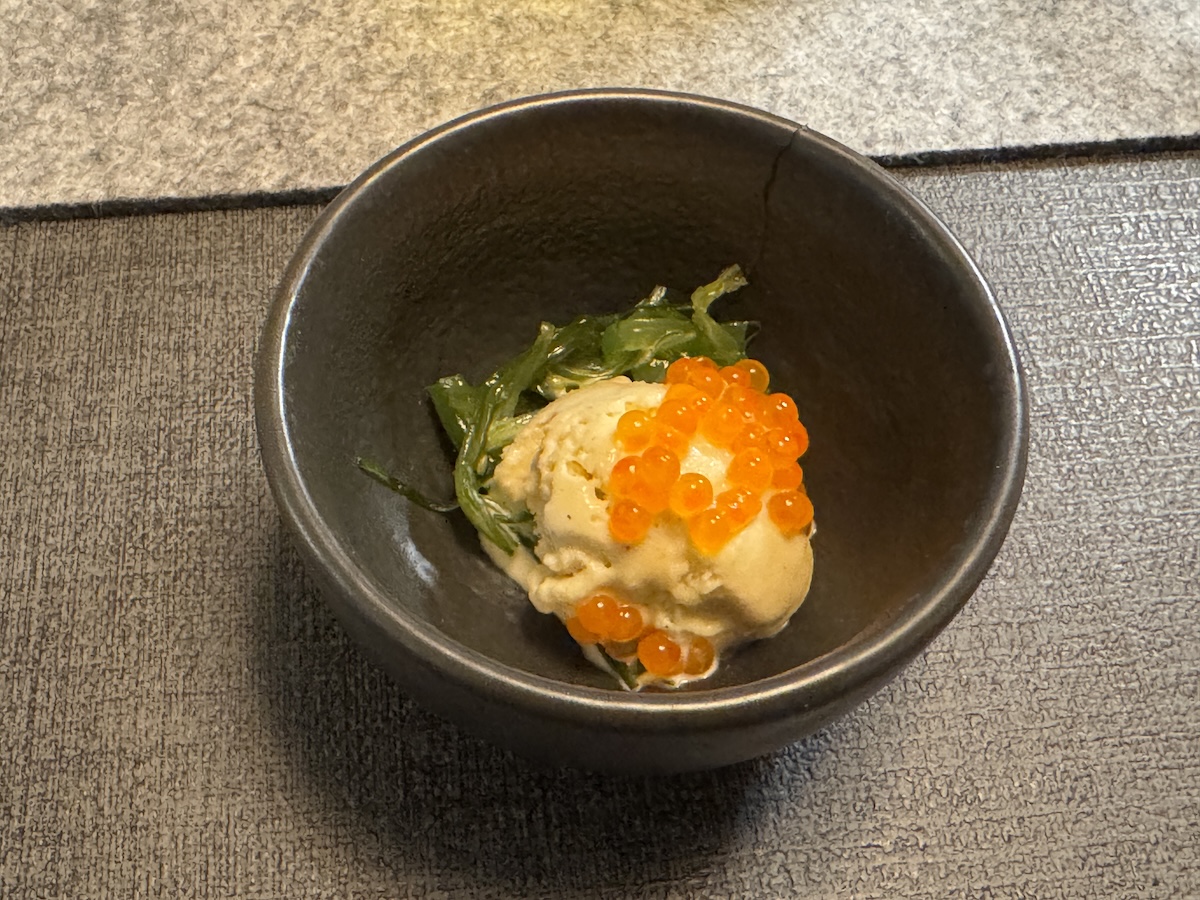 Jakobsmuschel mit Mais und Kerbel. Dazu 2019 Qvevri white