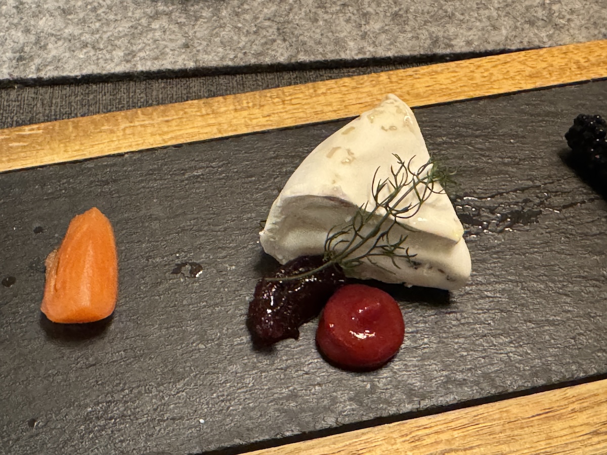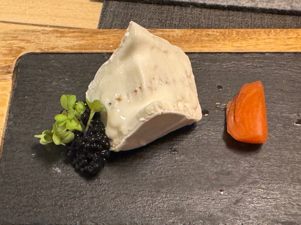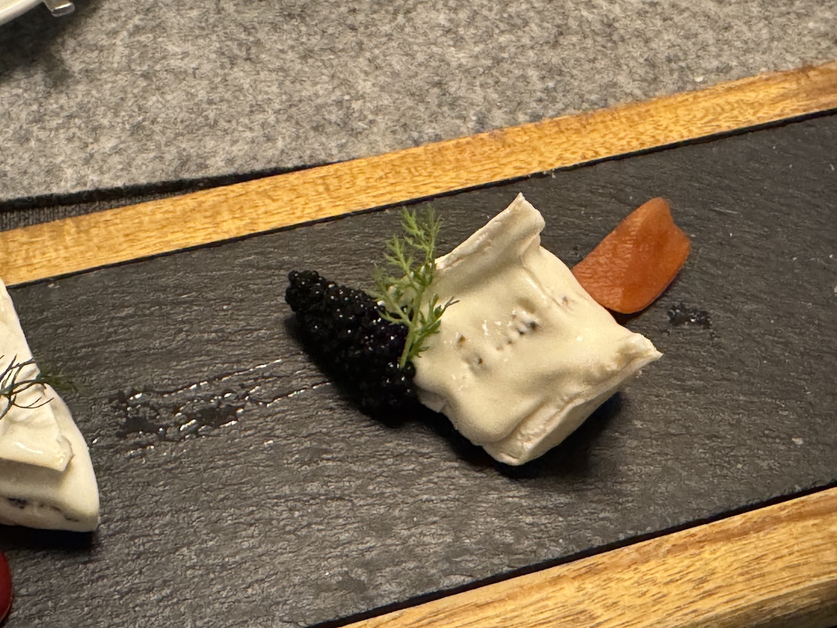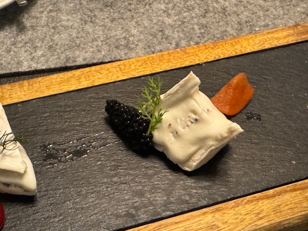 Kalbskopf-Carpaccio mit Steinpilze mit Wildkräuter. Dazu gab es einen 2022 Goruli Mitsvane.