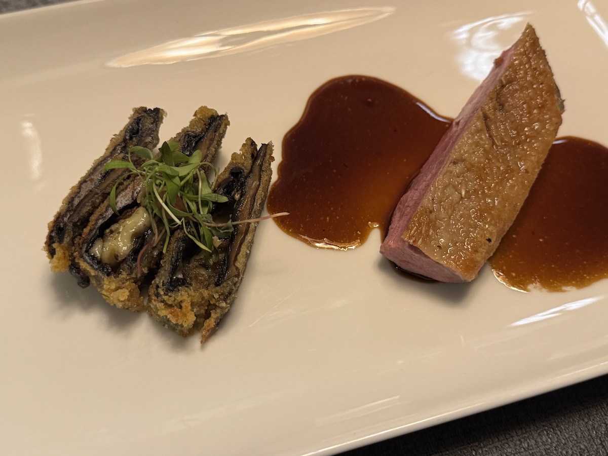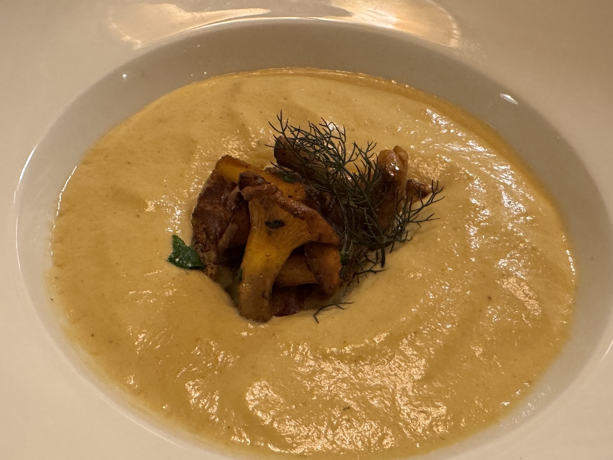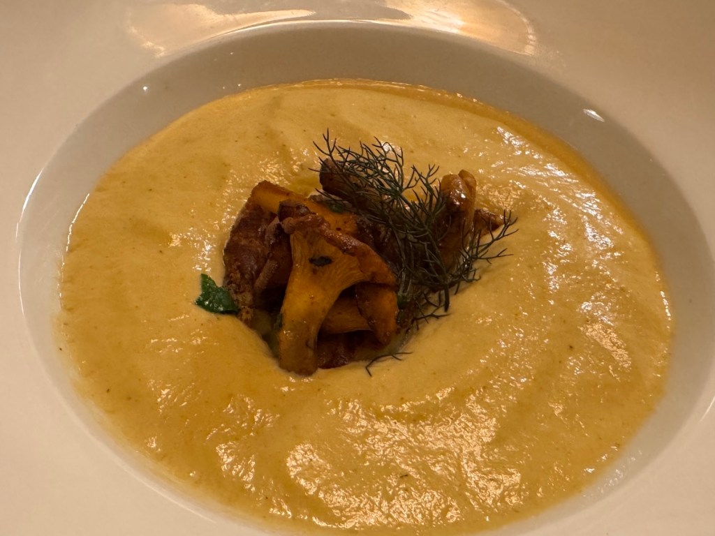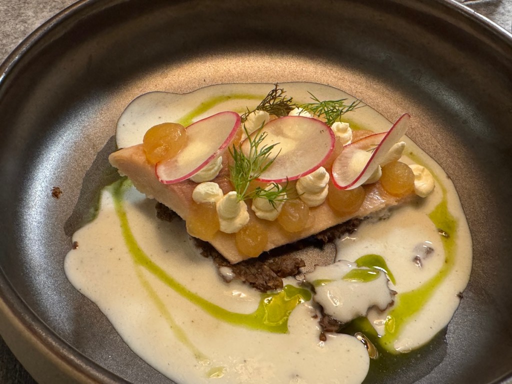 Kalbskopf-Carpaccio mit Steinpilze mit Wildkräuter. Dazu gab es einen 2022 Goruli Mitsvane.