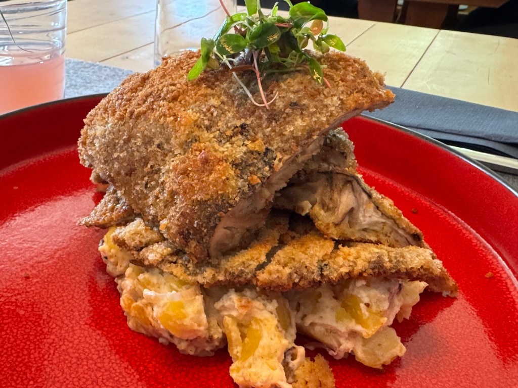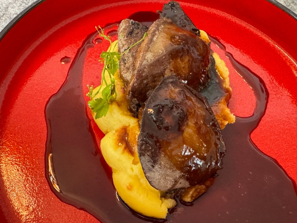 Ochsenschulter in Rotweinjus und Selleriepüree. Die Ochsenschulter ist seit neun Jahren auf der Karte vom Gasthof Heinzinger. Dazu 2021 Saperavi Supérieur