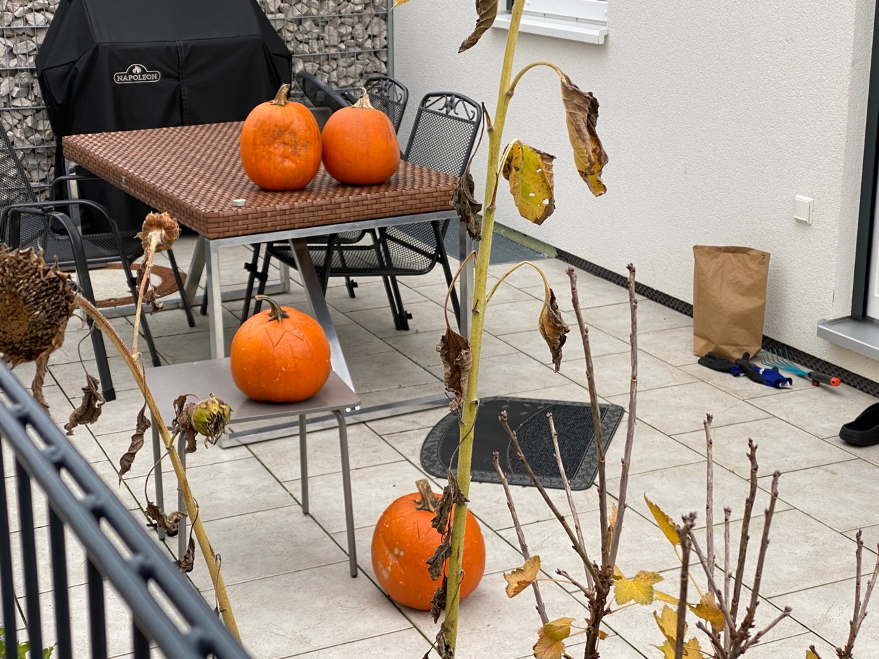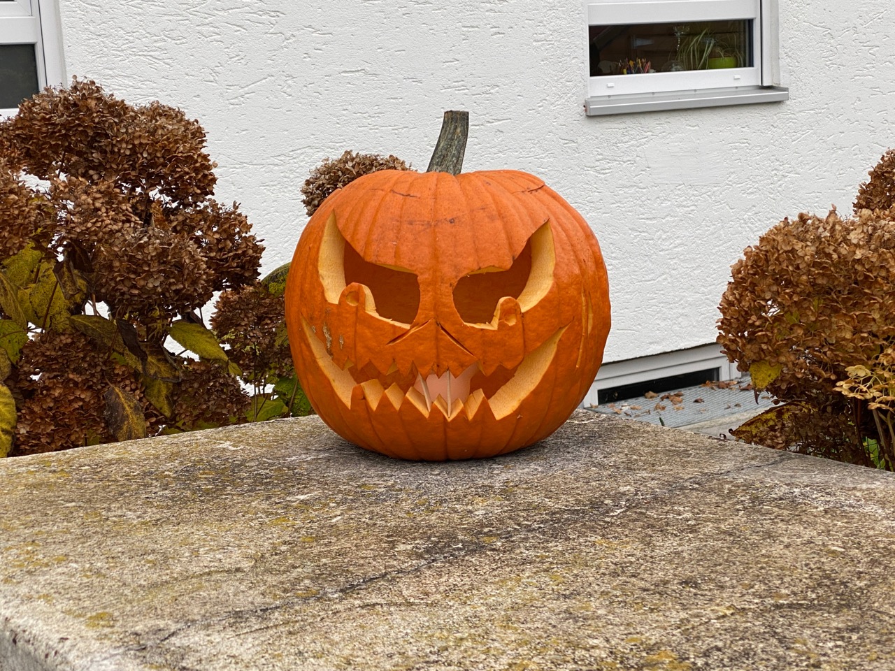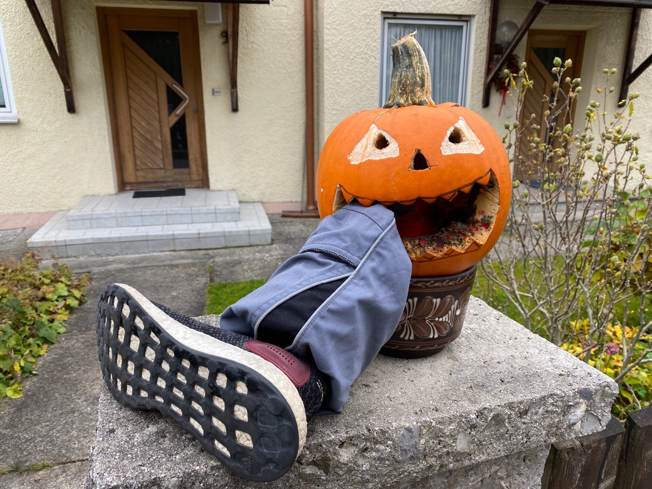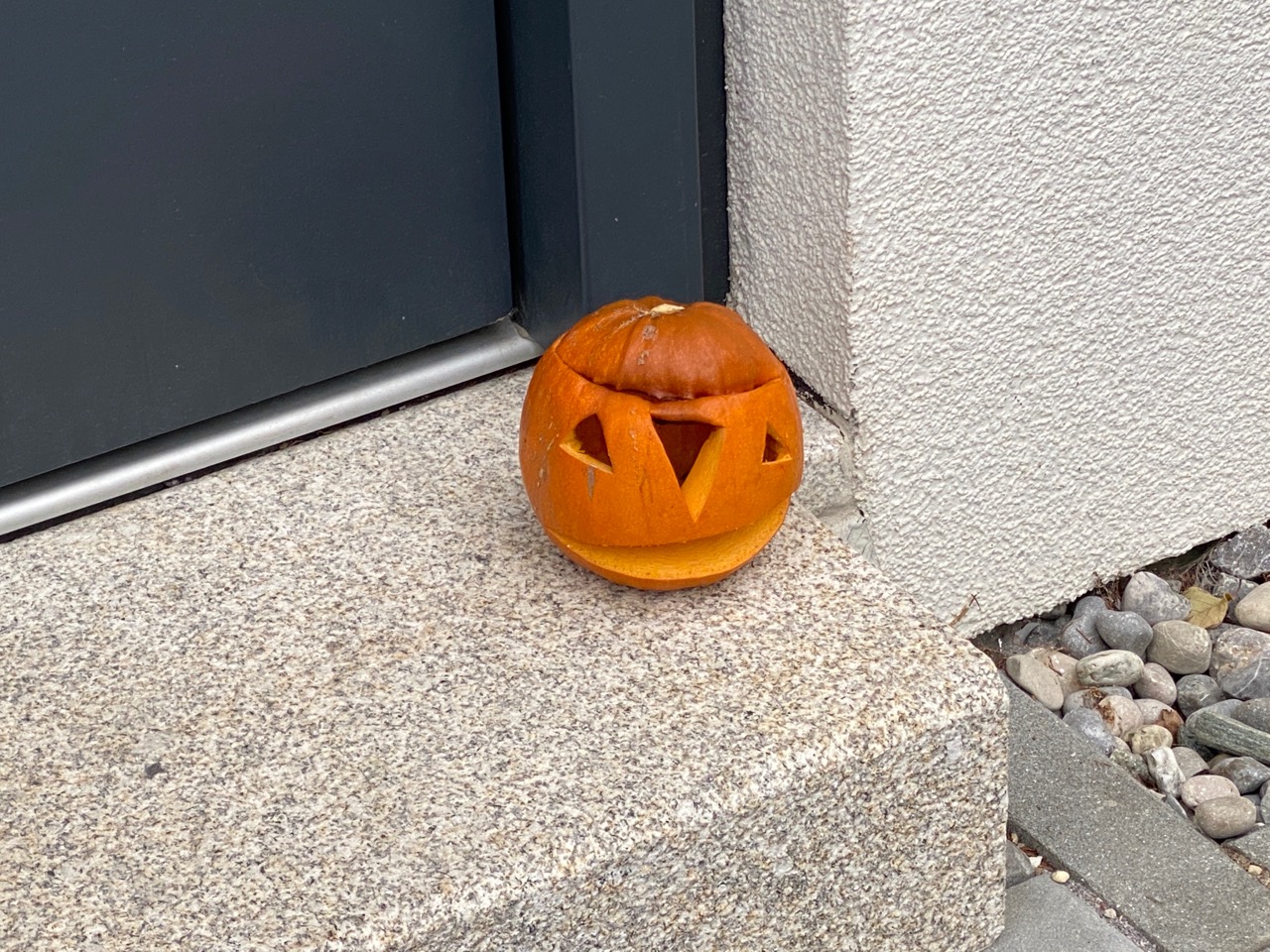 Zu Hause gab es auch kein Süßes und Saures – es hatte auch kein Kind geklingelt. Aber ein paar Familien bei uns im Dorf haben ein wenig Halloween-Stimmung verbreitet und Kürbisse vors Haus gestellt. Am Morgen nach Halloween beim Gang zum Bäcker habe ich ein paar von den Kürbissen fotografiert. Danke für diese freundliche Geste. Zu einem längeren Spaziergang hatte ich aufgrund Regen keine Lust. Bleibt gesund.