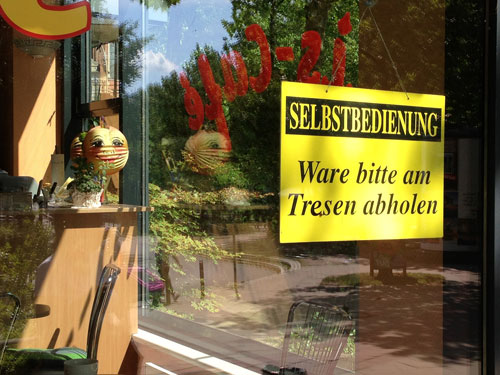 “Ware selbst am Tresen abholen.” heißt es eindeutig an der Scheibe der Eisdiele. Anschließend suche ich mir in der Eisdiele innen oder außen einen Platz und genieße mein Eis. Schließlich räume ich mein leeres Glas und den Löffel auf einen Servierwagen. “Benutztes Geschirr bitte hier ablegen!” erinnern mich auch zahlreiche Hinweisschilder.