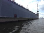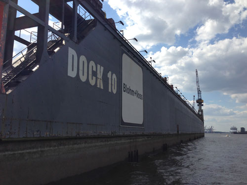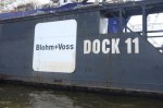 Als Medienmensch interessiert mich natürlich, wo in der Werbe- und Verlagsstadt Hamburg die größte Werbefläche liegt. Und ich wurde im Hamburger Hafen fündig. Es ist das Dock 10 der Traditionswerft Blohm & Voss. Die lange, lange Wand des Docks kann zu Werbezwecken gemietet werden. Leider hatte ich Pech: Bei meinem Besuch in Hamburg war kein Plakat aufgehängt zu sehen, aber ich kam bei einer Hafenrundfahrt zumindest ganz nah ran ans Dock.