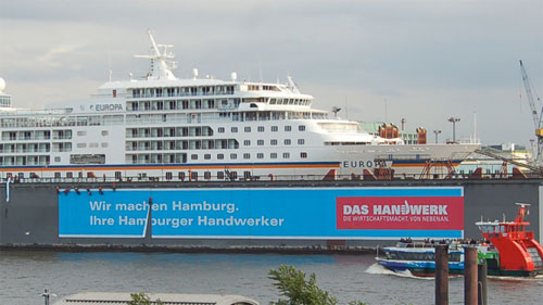 Immer wieder zeigen Automobilfirmen, Reedereien oder Fluglinien ihre neuen Produkte. Cool fand ich auch eine Aktion des Deutschen Handwerks, die ein riesiges Handwerksbanner am Dock 10 entrollten.