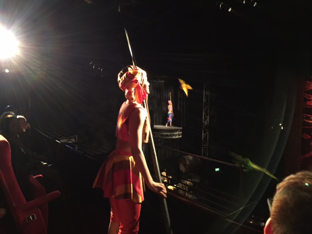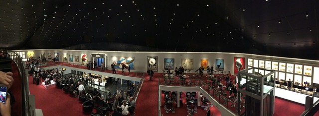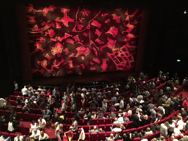 Endlich Einlass und weil wir in Deutschland sind, herrscht Gedränge beim Kartenabriss, beim Gang zur Toiliette, beim Anstehen vor dem Souvenir-Shop und beim Anstehen an der Bar. Das Foyer mit insgesamt sieben Bars auf drei Ebenen sowie das SKYLINE Restaurant mit einem schönen Blick auf die Landungsbrücken. Wir nahmen einen Cocktail und suchten unsere Plätze. Wenigstens kein Gedränge beim Einnehmen der Plätze – jeder hat ja seinen nummerierten Platz.