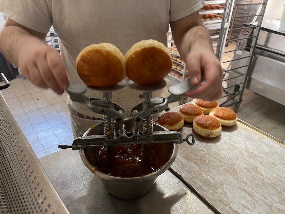 Der Standard-Krapfen ist ein Siedegebäck, das schwimmend in Fett ausgebacken wird. Er beseht aus süßem Hefeteig mit einer Füllung aus Konfitüre und meist mit feinem Zucker bestäubt oder mit einer Glasur überzogen wird. Ein wesentliches Kennzeichen des Krapfens ist sein heller Ring um die Mitte, auch Bauchbinde oder Ranft genannt. Dieser Ring entsteht, wenn der noch ungebackene Krapfen zunächst bei geschlossenem Deckel drei Minuten gebacken wird. Ich interessiere mich vor allem, wie die Marmelade in den Krapfen kommt. Dazu habe ich ein Video über die Krapfenproduktion gedreht.