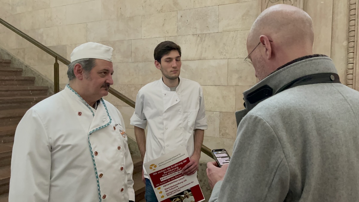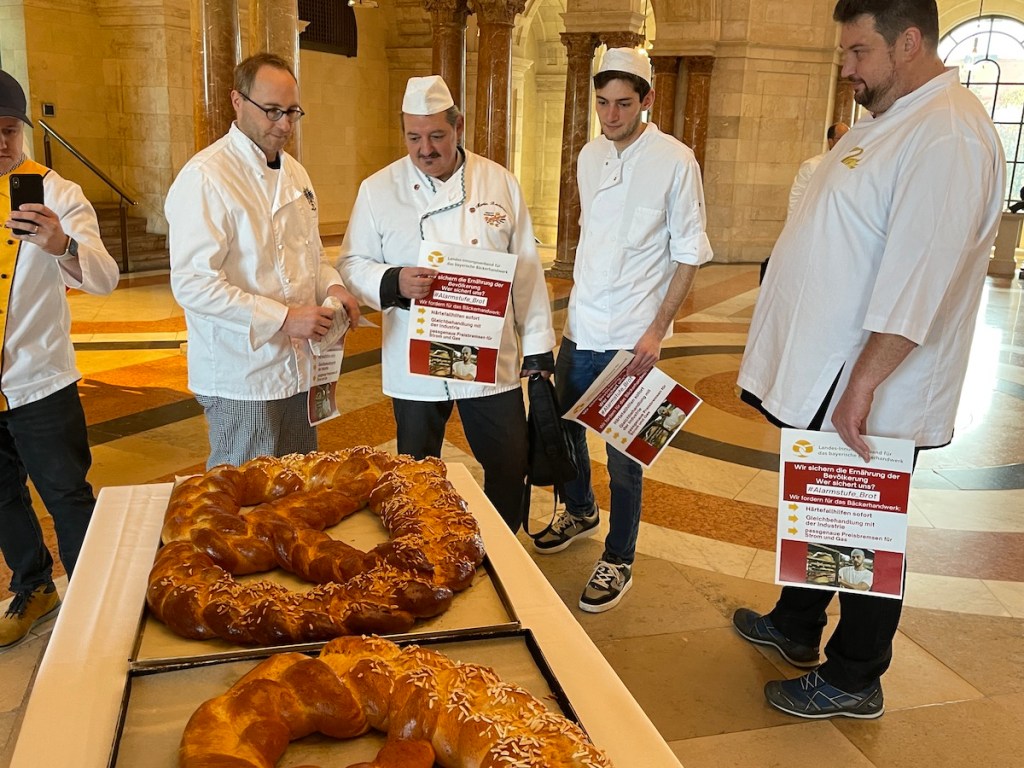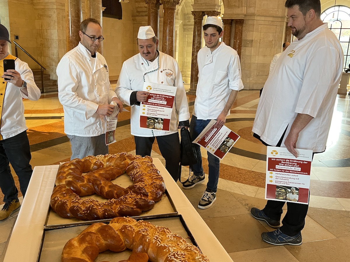 In ihrer weißen Arbeitskleidung und mit Plakaten gaben die Demonstranten ein eindrucksvolles Bild im Kuppelsaal der Staatskanzlei ab und hatten auch gleich zwei Riesenbrezn als Fotomotiv mitgebracht. Das Wichtigste waren aber die Forderungen, die der Geschäftsführer des Landesinnungsverbandes der Bäcker Stephan Kopp überreichte: Die Strompreisbremse in Höhe von 13 ct/kWh muss für alle Abnahmestellen in Handwerksbetrieben und nicht nur für die Industrie gelten. Und auch wichtig: Der Preisdeckel wird über alle Strompreisvereinbarungen über den Terminmarkt und/oder Spotmarkt gelegt, in denen Preise für den Bezugszeitraum 1.1.2023 bis 31.3.2024 vereinbart wurden oder werden.