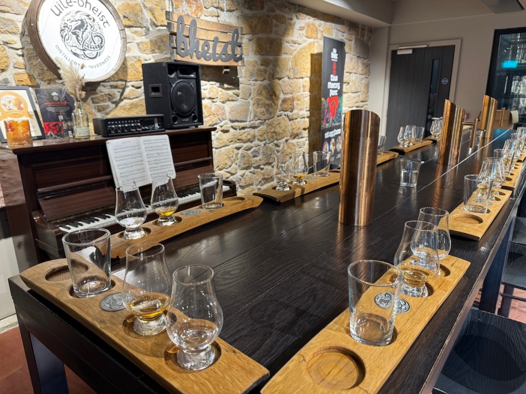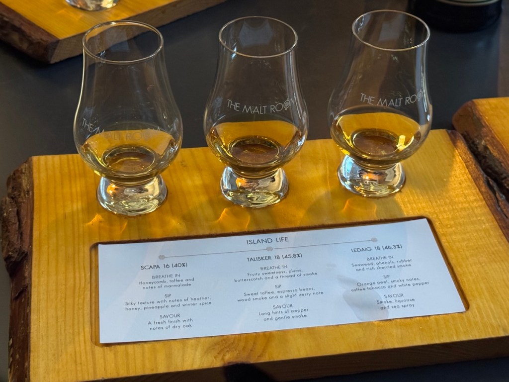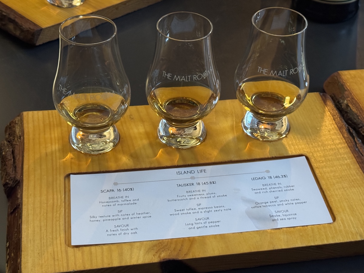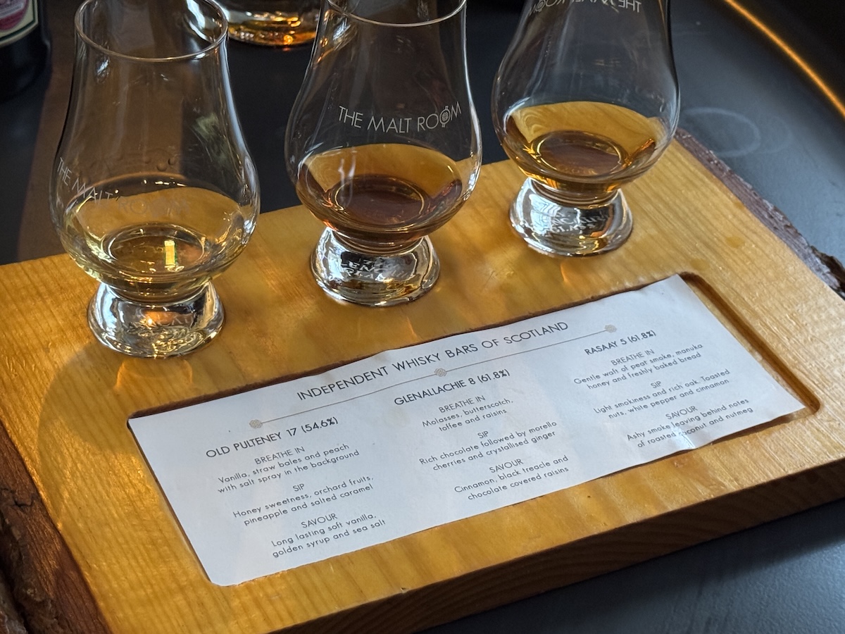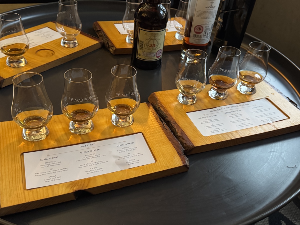 Ein Glas schottischer Whiskey ist ein Moment der Stille in einer lauten Welt. Er verlangt keine Eile, kein Spektakel – nur Aufmerksamkeit, Hingabe, vielleicht das leise Klingen zweier Gläser in der Dämmerung. Getrunken in guter Gesellschaft mit meiner Frau, am besten mit Blick auf einen See oder ein knisterndes Feuer, entfaltet er seine volle Romantik: nicht aufdringlich, sondern ehrwürdig. Wie eine Liebe, die langsam wächst und bleibt. Wir genossen das Getränk bei jeder Mahlzeit, bei jeden abendlichen Ausflug in den Pub. Und wir probierten viel aus. Im Malt Room in Inverness testeten wir Whiskey-Flights. Whiskey-Flights sind Verkostungssets, bei denen mehrere verschiedene Whiskeys in kleinen Mengen nebeneinander serviert werden – meist in Gläsern à 1–2 cl. Ziel ist es, die Unterschiede in Geschmack, Aroma, Farbe und Stil bewusst zu erleben und miteinander zu vergleichen. Die Flights wurden auf einem Holzbrett oder Tablett serviert, manchmal mit Beschreibungen oder in geführten Tastings. Sie eignen sich perfekt für mich, um den eigenen Geschmack zu entdecken und um Nuancen zu vergleichen. So etwas stelle ich mir in Deutschland auch vor, um Whiskey unters Volk zu bringen. Und ich meine nicht Whiskey-Cola.