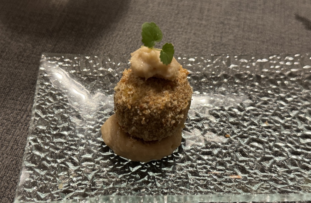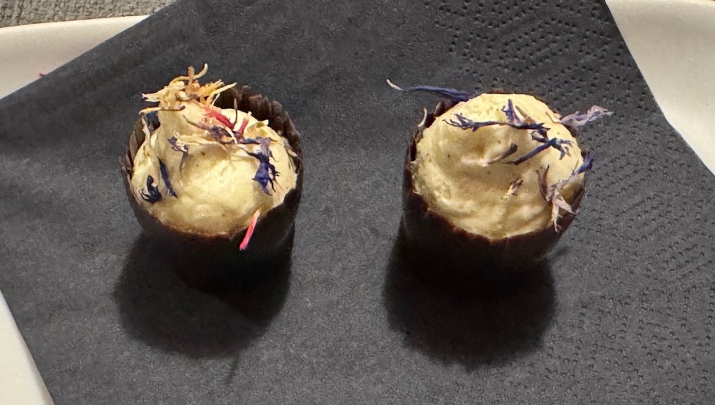 Das Silvestermenü begann mit einem Amuse Bouche, Gruß aus der Küche. Wir hatten eine Entenleberpraline.