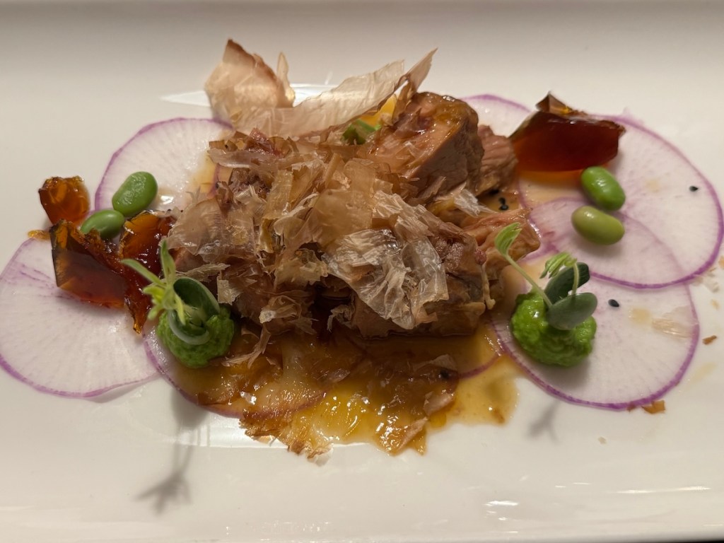 Der erste Gang war eine Schweinshaxe 2.0 mit Blue Meat Rettich, Wasabi und Edamame, Knocherlsulz und Bonitoflocken. Faszinierend die Verbindung zwischen bayerischer und asiatischer Küche auf hohem Niveau.