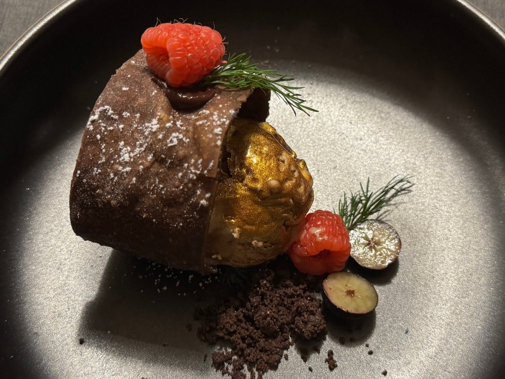 Das Dessert war ein Steinpilz-Eis mit Gold und Mokka-Schmalzgebäck.