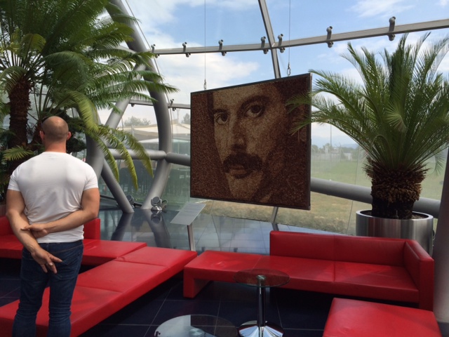 7. Juli 2014Vor 40 Jahren gelang der englischen Band Queen mit dem Album Queen II der internationale Durchbruch. Im Hangar 7 in Salzburg entdeckte ich auf einer Reise des PresseClubs München eine schöne Homage an den Queen-Sänger Freddie Mercury, der 1991 an AIDS verstarb. Der Sommelier des Restaurants Ikarus Daniel Kubini schuf sein persönliches Kunstwerk “The Queen of Cork”. Im Format 200 auf 260 Zentimeter stellt das Kunstwerk das Gesicht von Freddie Mercury dar – komplett aus Weinkorken. Insgesamt wurden dazu 11936 Korken verwendet.