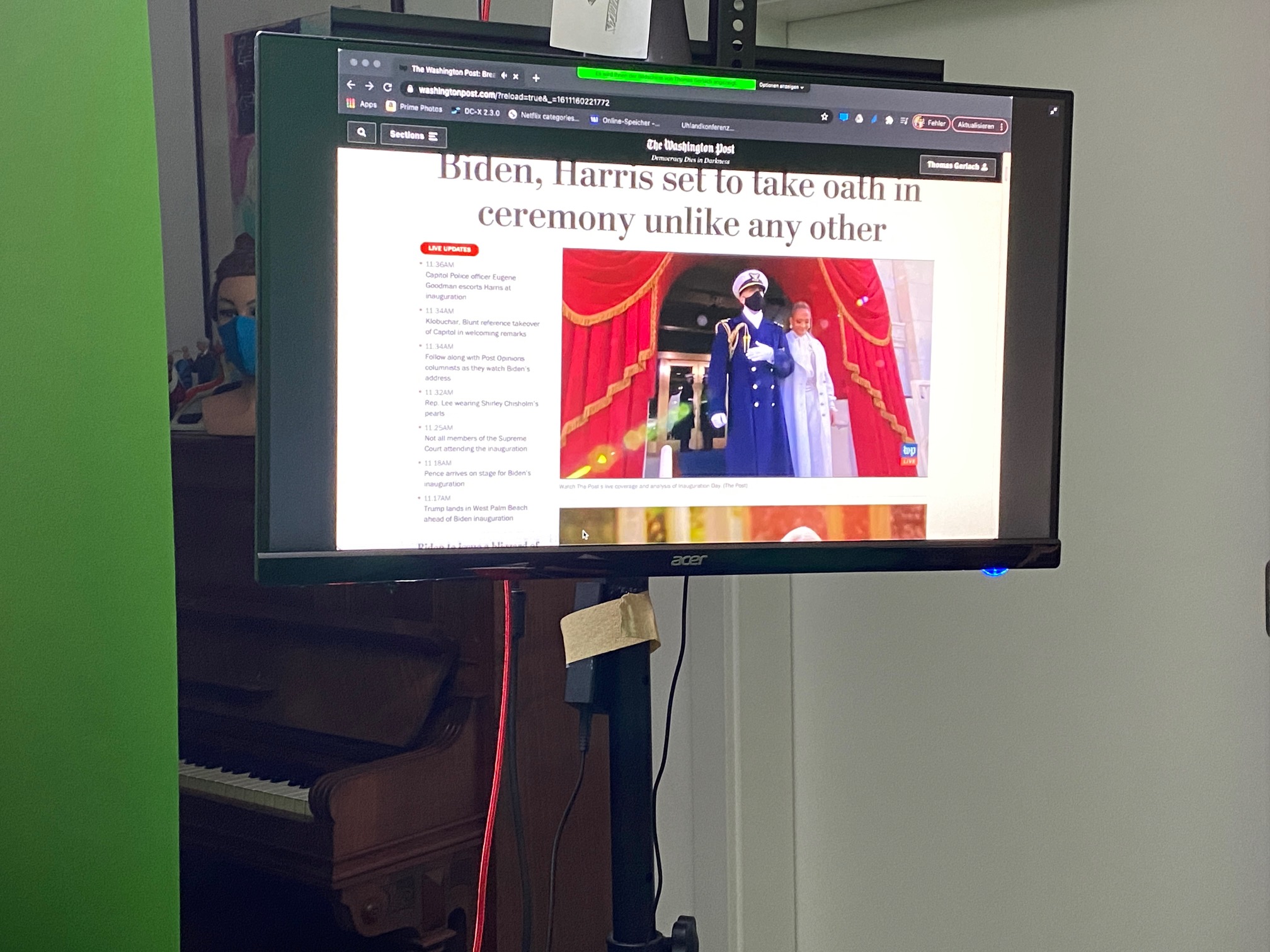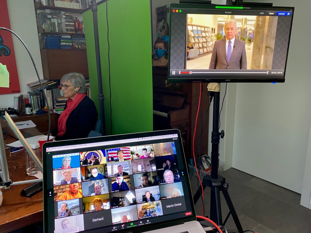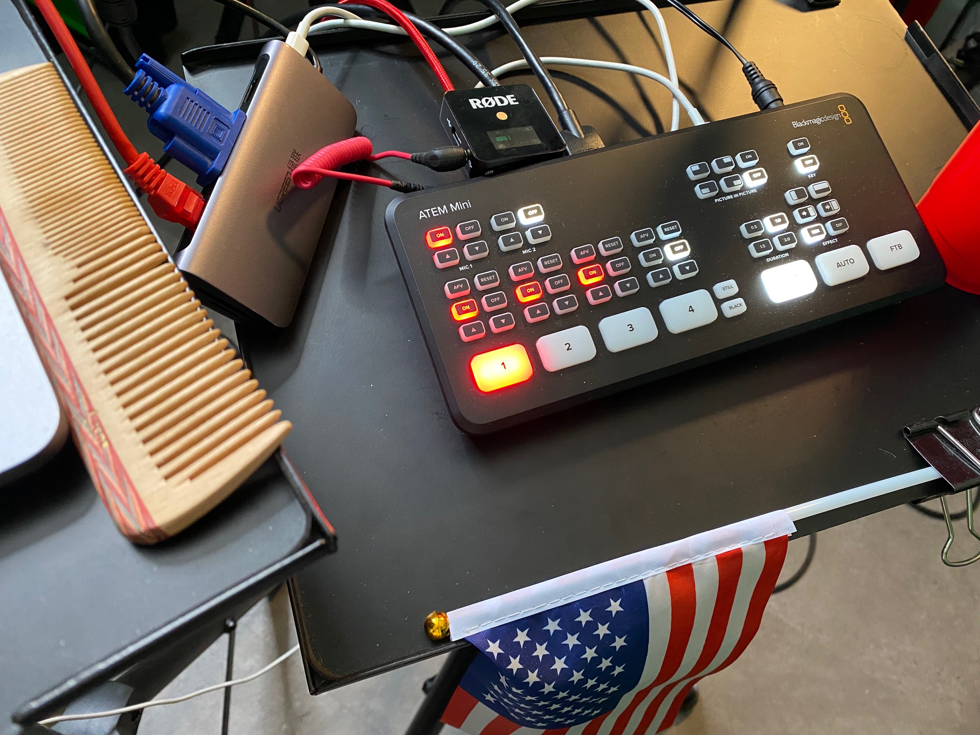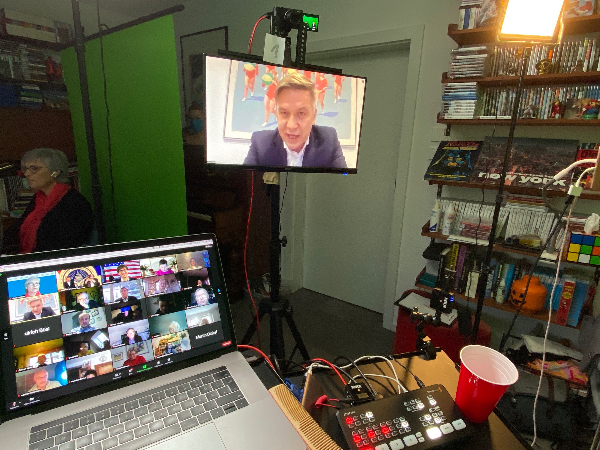 Also hat die ganze Familie zusammengearbeitet und aufgebaut. Im meinem Wohnzimmer wurde das Streaming-Studio mit Green-Screen, drei Kamera, mehreren Scheinwerfer und Videomischer ATEM mini und drei Stehpulte sowie Monitor errichtet. Auch eine Studio-Uhr gab es. Mit dem ATEM mini konnte ich auf verschiedene Kameraperspektiven schalten, damit der Zuschauer auch optisch eine Abwechslung erhält. Als virtueller Hintergrund wurde eine US-Fahne im Wind eingeblendet, denn: Auch der Hintergrund erzählt eine Geschichte.