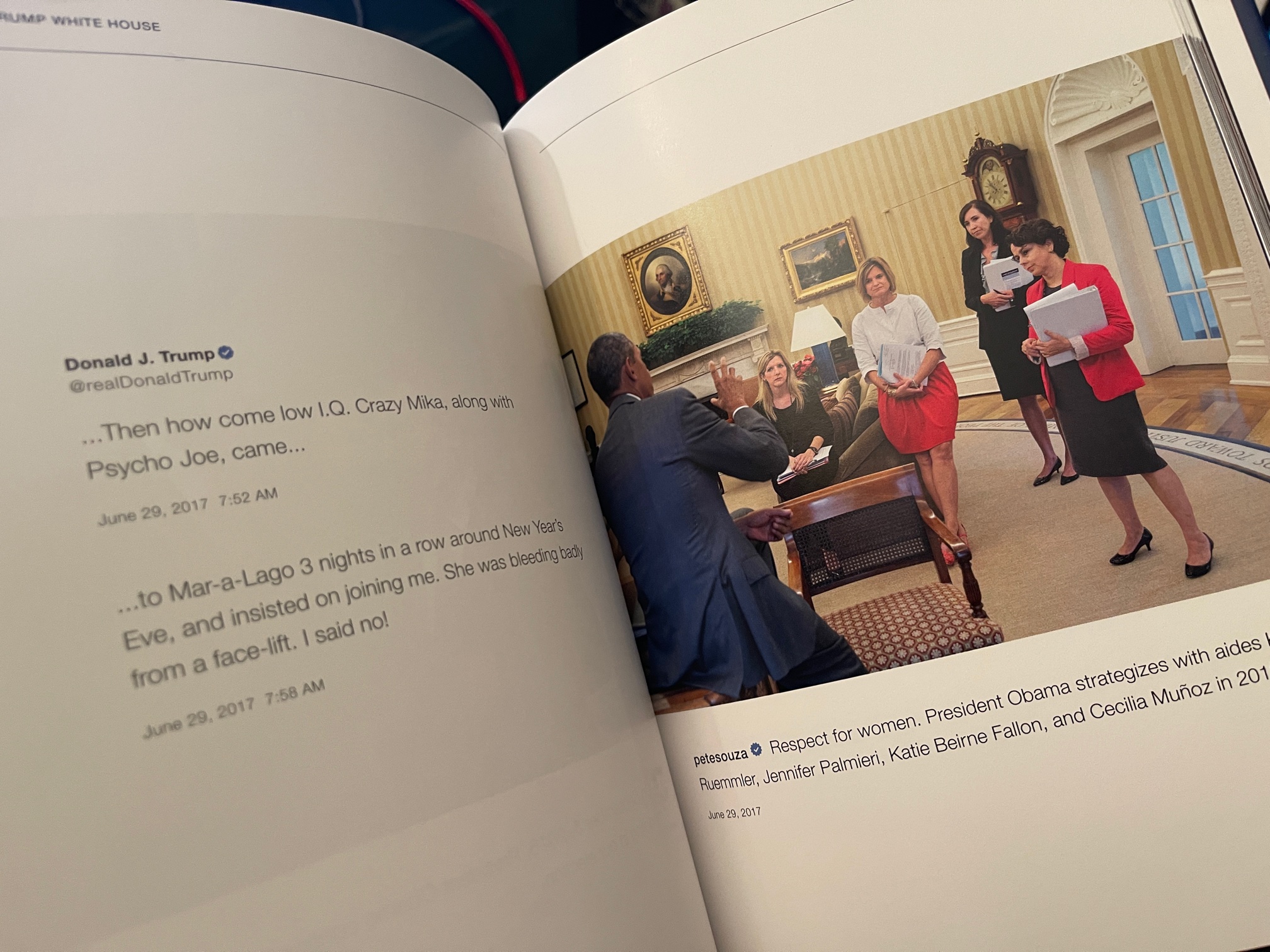 Im Hinblick auf mögliche verlorene Tweeds von Trump, hatte 2018 Souza schon eine gute Idee. Er meldete sich mit seinem Buch Shade zu Wort. Es ist ein Porträt in Kontrasten, das die Geschichte der Obama- und Trump-Administration durch eine Reihe von visuellen Gegenüberstellungen erzählt – sehr originell übrigens. Mehr als einhundert von Souzas Bildern von Präsident Obama bekommen hier einen neuen Dreh. Im Grunde ist es eine neue Variante der Resteverwertung. Die Fotos von Shade: A Tale of Two Presidents werden von den Tweets, Schlagzeilen und Zitaten eingerahmt, die die ersten 500 Tage im Weißen Haus von Trump bestimmt haben. Erschreckende Aussagen zum Teil, die für mich den Charakter Trumps offenbaren.