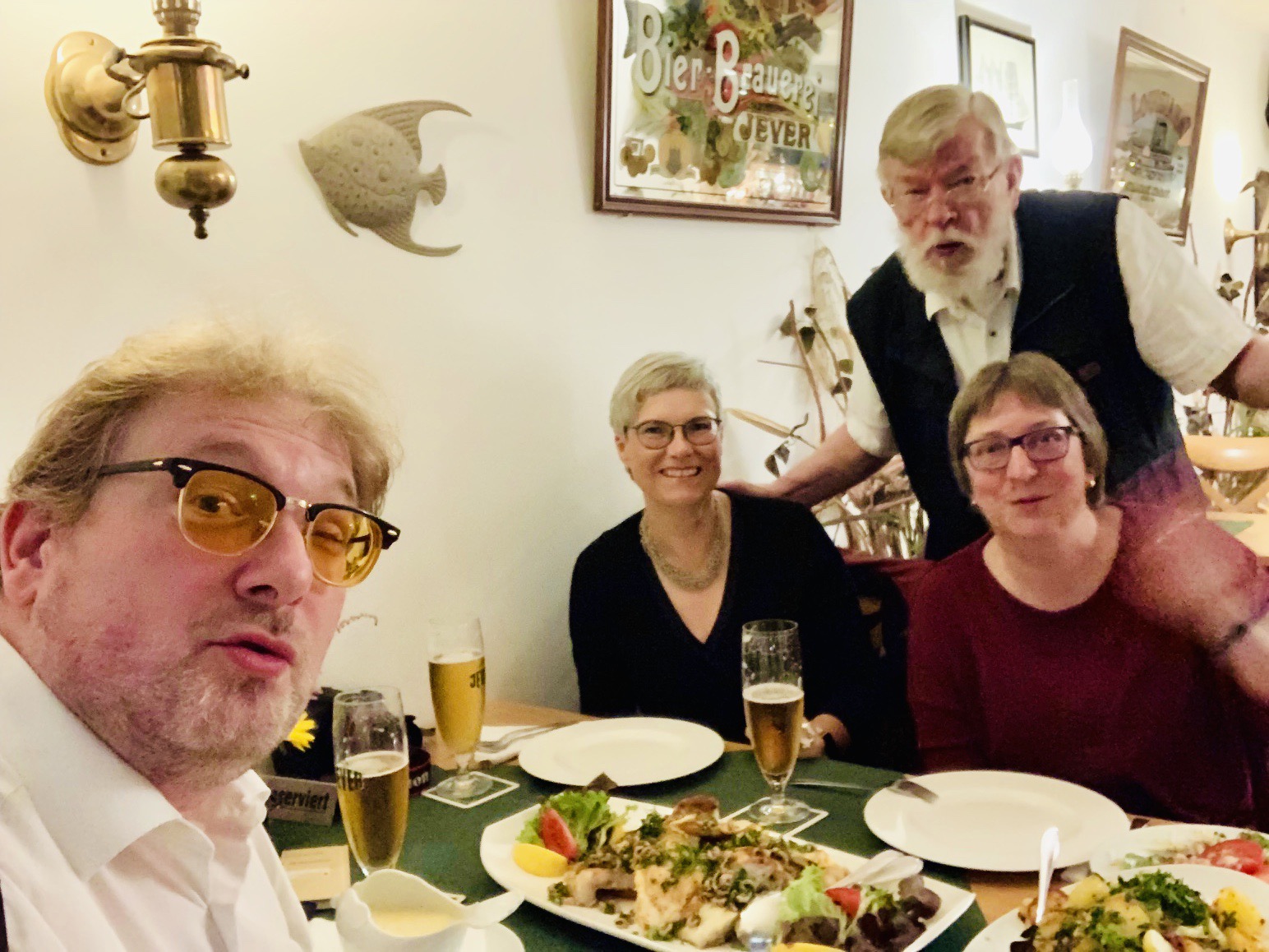 Der „Seewolf“ versteht sich seit Jahren als traditionelles Lokal mit dem Schwerpunkt Fischgerichte – seit 1996 in Sierksdorf, danach 2001 am Hafen in Neustadt/Holstein und ab September 2009 in Lübeck am Stadthafen in der Nähe vom Holstentor und gegenüber der Musik- und Kongresshalle. Das Lokal ist voll auf Fischerei getrimmt und für mich als Bayer wunderbar. Schiffsmodelle, Hans Albers-Bild, Fischernetze, allerlei maritime Einrichtungsgegenstände und wundervolle Blumengestecke der Besitzerin Rosi Engelhardt. Für mich als Fan von Registrierkassen gibt es eine über 100 Jahre alte Kasse auf den Tresen. Sie ist natürlich mit dem Taucherhelm nur Deko, aber was für eine schöne Deko.